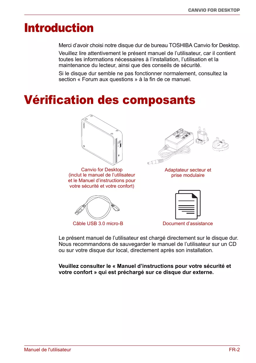 CANVIO FOR DESKTOP Introduction Merci d’avoir choisi notre disque dur de bureau TOSHIBA Canvio for Desktop. Veuillez lire attentivement le présent manuel de l’utilisateur, car il contient toutes les informations nécessaires à l’installation, l’utilisation et la maintenance du lecteur, ainsi que des conseils de sécurité. Si le disque dur semble ne pas fonctionner normalement, consultez la section « Forum aux questions » à la fin de ce manuel.