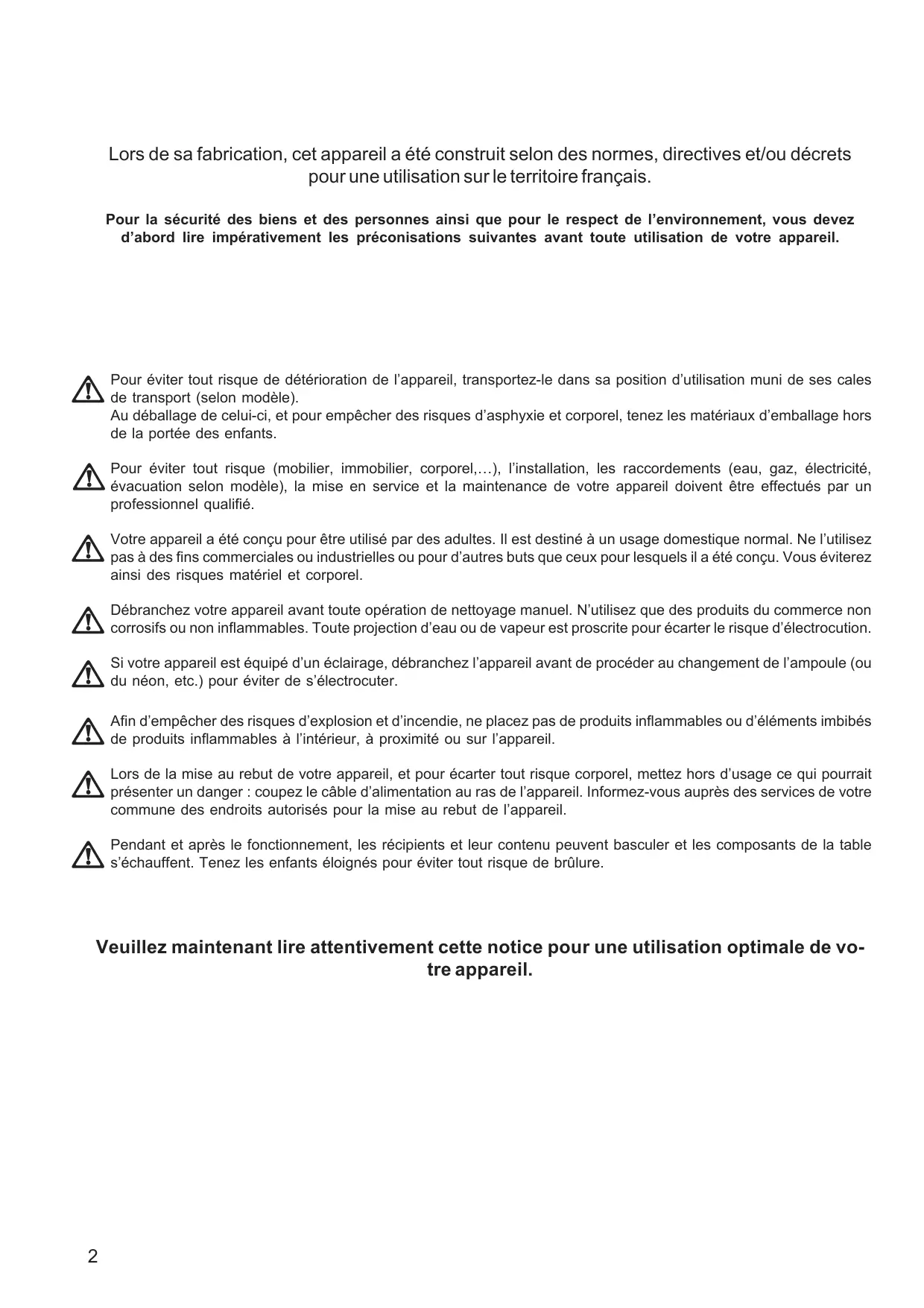 Pour la sécurité des biens et des personnes ainsi que pour le respect de l'environnement, vous devez d'abord dire impératifement les préconisations suivantes avant toute utilisation de votre apparéil.
