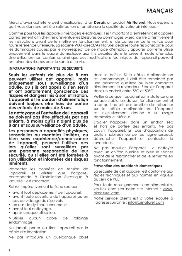 Desair déshumidificateur d’air Notice d’utilisation User manual Bedienungsanleitung Instrukcja obsługi Brukermanual Käyttöohje Gebruiksaanwijzing www.airnaturel.com FRANÇAIS Merci d’avoir acheté le déshumidificateur d’air Desair, un produit Air Naturel. Nous espérons qu’il vous donnera entière satisfaction et améliorera la qualité de votre air intérieur. Comme pour tous les appareils ménagers électriques, il est important d’entretenir cet appareil correctement afin d’éviter d’éventuelles blessures ou dommages. Merci de lire attentivement les instructions avant de le mettre en fonctionnement, et de conserver cette notice pour toute référence ultérieure. La société WAF-direct/Air Naturel décline toute responsabilité pour les dommages causés par le non-respect de ce mode d‘emploi. L‘appareil doit être utilisé uniquement dans le cadre domestique aux fins décrites dans le présent mode d‘emploi. Une utilisation non conforme, ainsi que des modifications techniques de l‘appareil peuvent entraîner des risques pour la santé et la vie.