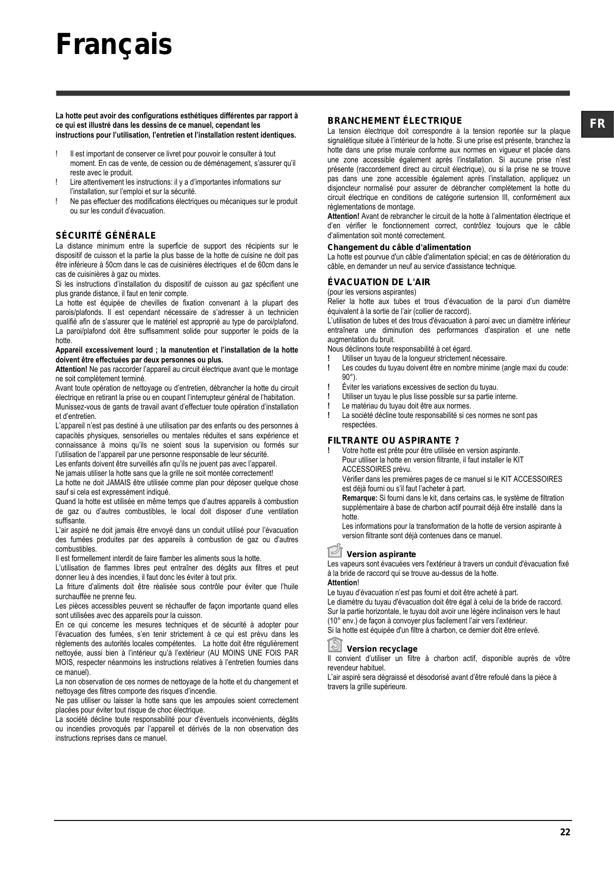 Il est important de conserver ce livret pour pouvoir le consulter à tout moment. En cas de vente, de cession ou de déménagement, s’assurer qu’il reste avec le produit. Lire attentivement les instructions: il y a d’importantes informations sur l’installation, sur l’emploi et sur la sécurité. Ne pas effectuer des modifications électriques ou mécaniques sur le produit ou sur les conduit d’évacuation.