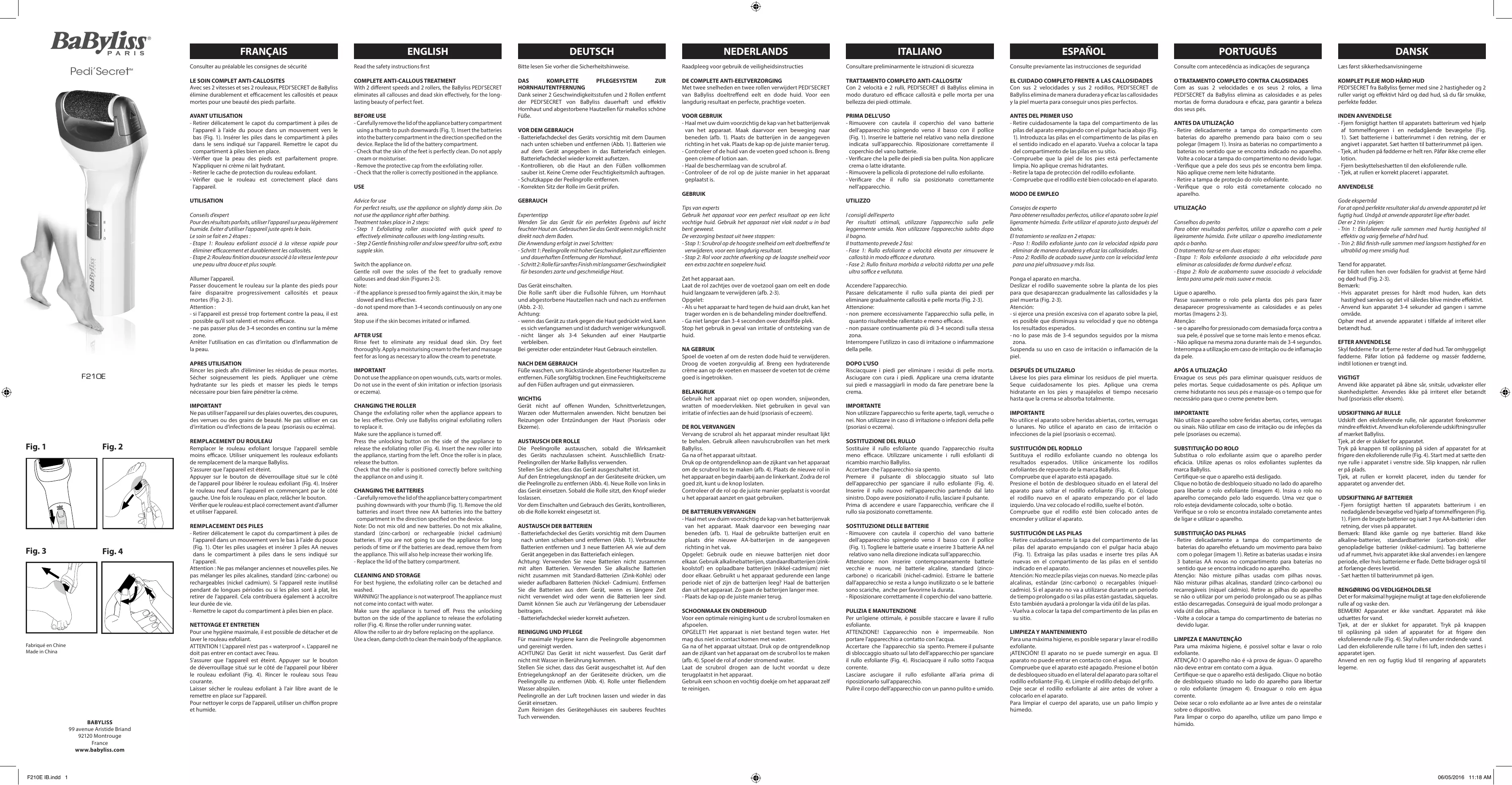 Pour une hygiène maximale, il est possible de détacher et de laver le rouleau exfoliant. ATTENTION ! L’appareil n’est pas « waterproof ». L’appareil ne doit pas entrer en contact avec l’eau. S’assurer que l’appareil est éteint. Appuyer sur le bouton de déverrouillage situé sur le côté de l’appareil pour libérer le rouleau exfoliant (Fig. 4). Rincer le rouleau sous l’eau courante. Laisser sécher le rouleau exfoliant à l’air libre avant de le remettre en place sur l’appareil. Pour nettoyer le corps de l’appareil, utiliser un chiffon propre et humide. Fabriqué en Chine Made in China ESPAÑOL Raadpleeg voor gebruik de veiligheidsinstructies IMPORTANT Ne pas utiliser l’appareil sur des plaies ouvertes, des coupures, des verrues ou des grains de beauté. Ne pas utiliser en cas d’irritation ou d’infections de la peau (psoriasis ou eczéma). Fig. 4 ITALIANO Bitte lesen Sie vorher die Sicherheitshinweise. APRES UTILISATION Rincer les pieds afin d’éliminer les résidus de peaux mortes. Sécher soigneusement les pieds. Appliquer une crème hydratante sur les pieds et masser les pieds le temps nécessaire pour bien faire pénétrer la crème. Fig. 3 NEDERLANDS Read the safety instructions first Allumer l’appareil. Passer doucement le rouleau sur la plante des pieds pour faire disparaitre progressivement callosités et peaux mortes (Fig. 2-3). Attention : - si l’appareil est pressé trop fortement contre la peau, il est possible qu’il soit ralenti et moins efficace. - ne pas passer plus de 3-4 secondes en continu sur la même zone. Arrêter l’utilisation en cas d’irritation ou d’inflammation de la peau. Fig. 2 DEUTSCH Consulter au préalable les consignes de sécurité Conseils d’expert Pour des résultats parfaits, utiliser l’appareil sur peau légèrement humide. Eviter d’utiliser l’appareil juste après le bain. Le soin se fait en 2 étapes : - Etape 1: Rouleau exfoliant associé à la vitesse rapide pour éliminer efficacement et durablement les callosités. - Etape 2: Rouleau finition douceur associé à la vitesse lente pour une peau ultra douce et plus souple. Fig. 1 ENGLISH USE Switch the appliance on. Gentle roll over the soles of the feet to gradually remove callouses and dead skin (Figures 2-3). Note: - if the appliance is pressed too firmly against the skin, it may be slowed and less effective. - do not spend more than 3-4 seconds continuously on any one area. Stop use if the skin becomes irritated or inflamed. AFTER USE Rinse feet to eliminate any residual dead skin. Dry feet thoroughly. Apply a moisturising cream to the feet and massage feet for as long as necessary to allow the cream to penetrate. IMPORTANT Do not use the appliance on open wounds, cuts, warts or moles. Do not use in the event of skin irritation or infection (psoriasis or eczema).