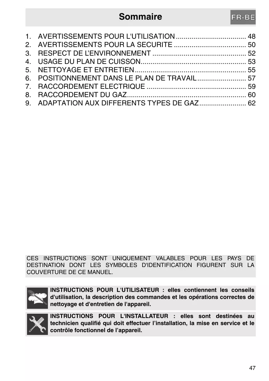 USAGE DU PLAN DE CUISSON 53 NETTOYAGE ET ENTRETIEN 55 POSITIONNEMENT DANS LE PLAN DE TRAVAIL 57 RACCORDEMENT ELECTRIQUE 59 RACCORDEMENT DU GAZ 60 ADAPTATION AUX DIFFERENTS TYPES DE GAZ 62