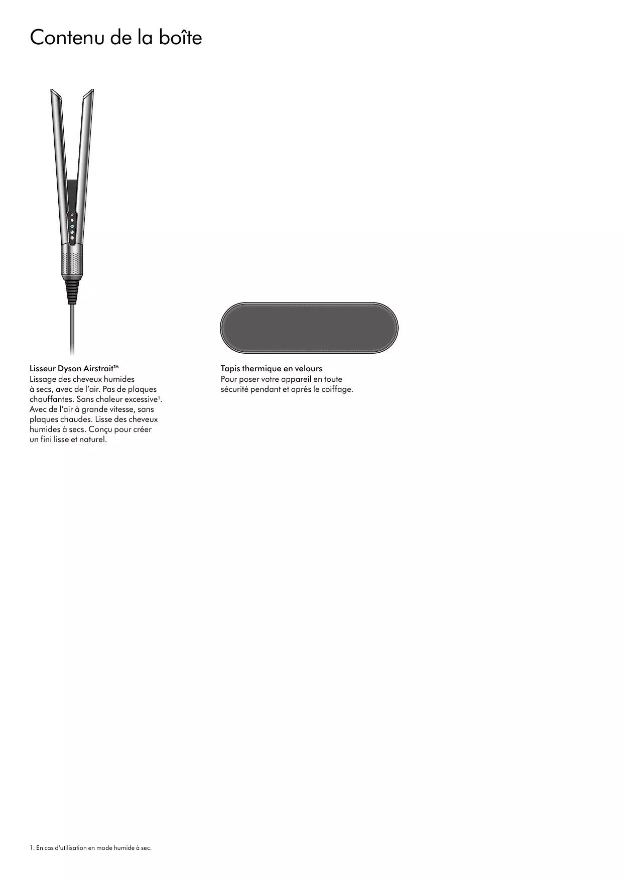 Tous nos Tutos vidéo Darty.com Tous nos magasins Communauté SAV Darty Contenu de la boîte Lisseur Dyson Airstrait™ Lissage des cheveux humides à secs, avec de l’air. Pas de plaques chauffantes. Sans chaleur excessive¹. Avec de l’air à grande vitesse, sans plaques chaudes. Lisse des cheveux humides à secs. Conçu pour créer un fini lisse et naturel.
