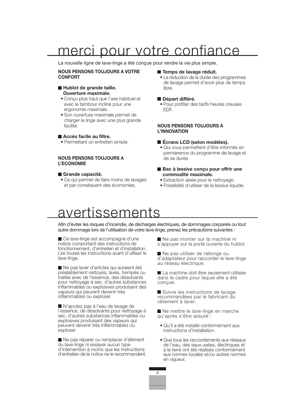 Chère Cliente, Cher Client, Vous venez d’acquérir un lave-linge à chargement par le devant BRANDT et nous vous en remercions. Nous avons mis dans cet appareil toute notre passion, notre savoir-faire pour qu’il réponde au mieux à vos besoins. Innovant, performant, nous l’avons conçu pour qu’il soit aussi toujours facile à utiliser. Vous trouverez également dans la gamme des produits BRANDT, un vaste choix de fours, de fours à micro-ondes, de tables de cuisson, de hottes aspirantes, de cuisinières, de lave-vaisselle, de sèche-linge, de réfrigérateurs et congélateurs que vous pourrez coordonner à votre nouveau lave-linge BRANDT. Bien entendu, dans un souci permanent de satisfaire le mieux possible vos exigences vis à vis de nos produits, notre service consommateurs est à votre disposition et à votre écoute pour répondre à toutes vos questions ou suggestions (coordonnées à la fin de ce livret). Et retrouvez-nous aussi sur notre site www.brandt.fr sur lequel vous trouverez tous nos produits, ainsi que des informations utiles et complémentaires.