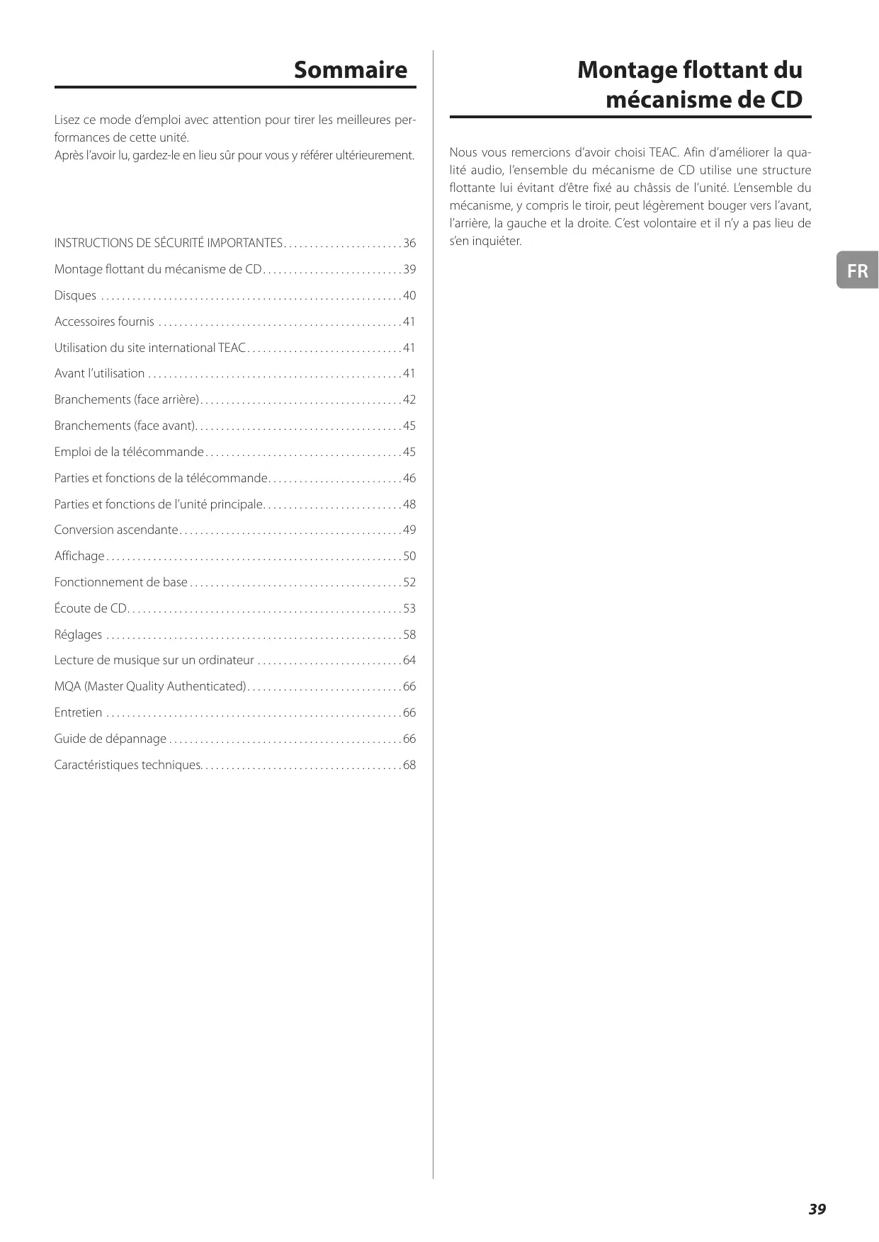 international TEAC Avant l’utilisation o Cet équipement est très lourd, faites attention à ne pas vous blesser en ouvrant son emballage et en le déplaçant. o Les pièces en forme de poignée situées sur les côtés gauche et droit de la face avant sont décoratives. N’y passez pas les doigts et ne les utilisez pas pour porter l’unité. o N’installez pas cette unité dans un lieu qui pourrait chauffer. Cela comprend les endroits exposés directement au soleil ou près d’un radiateur, d’un chauffage, d’une cuisinière ou d’autres appareils chauffants. En outre, ne la placez pas au-dessus d’un amplificateur ou autre équipement dégageant de la chaleur. Cela pourrait causer une décoloration, une déformation ou un mauvais fonctionnement. o Évitez les endroits sujets aux vibrations ou exposés à une poussière excessive, au froid et à l’humidité. o Quand vous installez cette unité, laissez un peu d’espace (au moins
