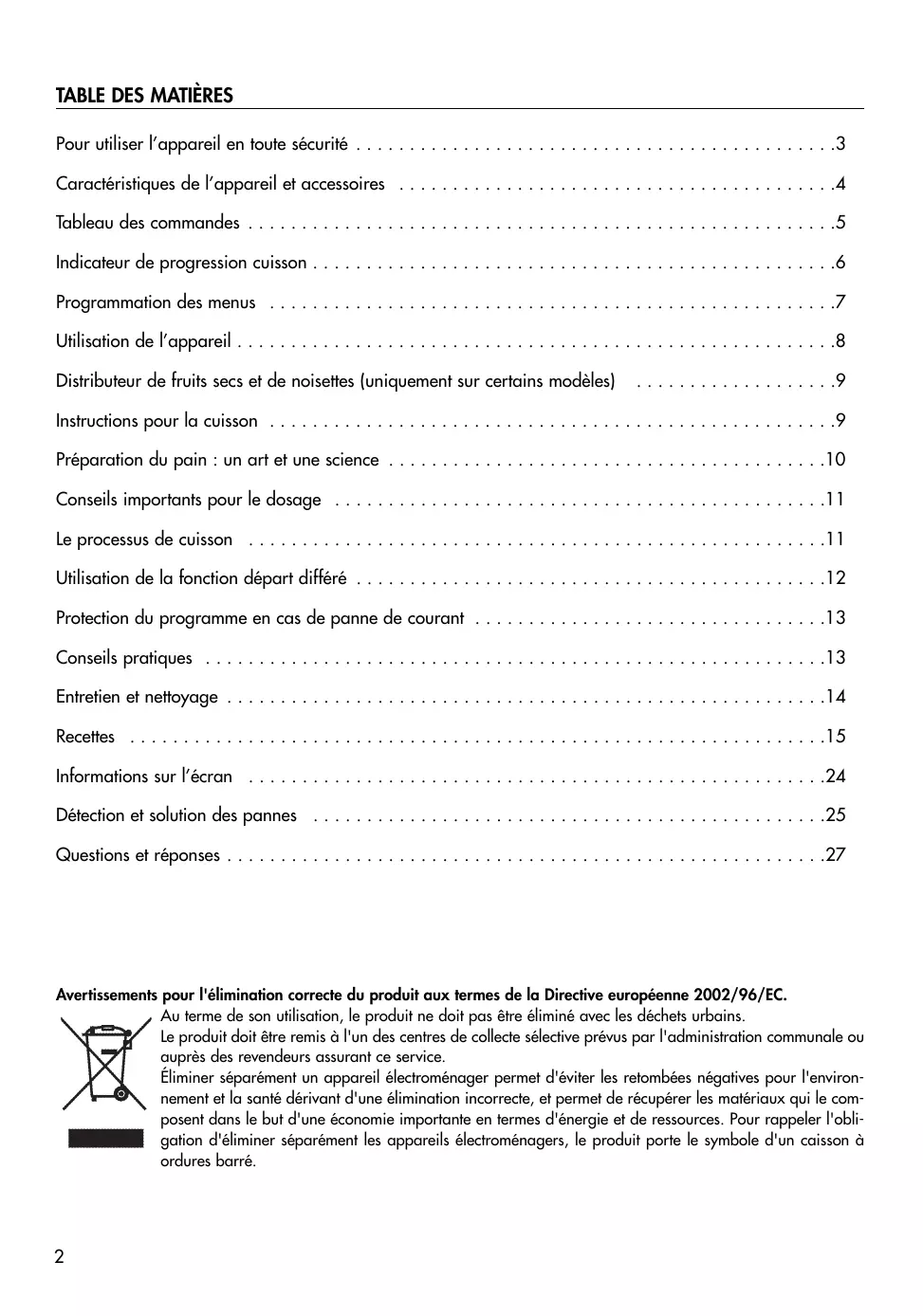 • Questions et réponses Avertissements pour l'élimination correcte du produit aux termes de la Directive européenne 2002/96/EC. Au terme de son utilisation, le produit ne doit pas être éliminé avec les déchets urbains. Le produit doit être remis à l'un des centres de collecte sélective prévus par l'administration communale ou auprès des revendeurs assurant ce service. Éliminer séparément un appareil électroménager permet d'éviter les retombées négatives pour l'environnement et la santé dérivant d'une élimination incorrecte, et permet de récupérer les matériaux qui le composent dans le but d'une économie importante en termes d'énergie et de ressources. Pour rappeler l'obligation d'éliminer séparément les appareils électroménagers, le produit porte le symbole d'un caisson à ordures barré. p. 27