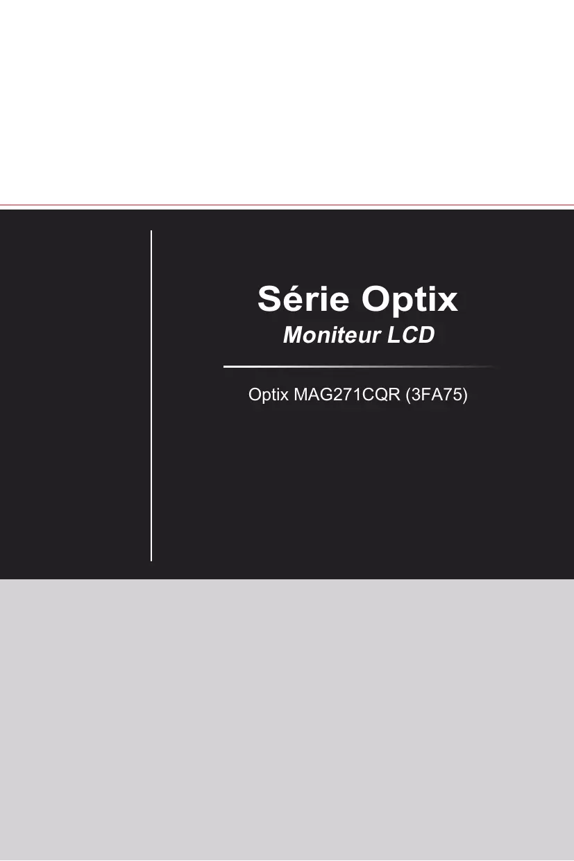 Série Optix Moniteur LCD Optix MAG271CQR (3FA75) Table des matières Avis relatif au droit d’auteur et aux marques commercialesiii Révisioniii Assistance techniqueiii Consignes de sécuritéiv Confirmité CEvi Déclaration concernant les interférences de radiofréquence FCC-Bvi Déclaration DEEEvii Informations sur les substances chimiquesvii Pour Commencer1-1 Contenu de l’emballage 1-2 Installation du socle de moniteur 1-3 Réglage du moniteur 1-4 Vue d’ensemble du moniteur 1-5 Raccordement du moniteur au PC 1-7 Configuration OSD 2-1 Touche Navi 2-2