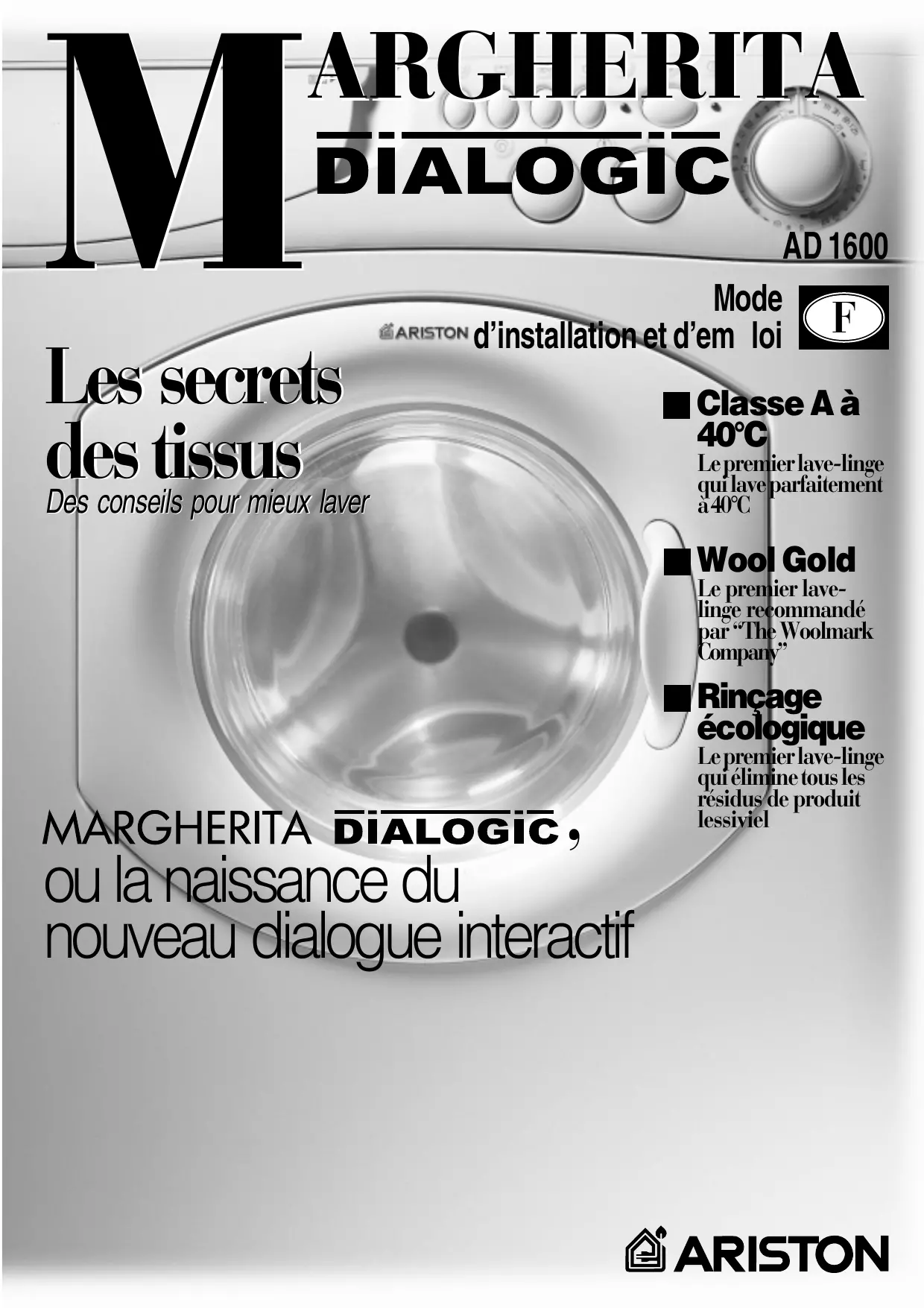 ARGHERITA Les secrets des tissus Des conseils pour mieux laver AD 1600 Mode dinstallation et demploi F Classe A à 40°C Le premier lave-linge qui lave parfaitement à 40°C Wool Gold Le premier lavelinge recommandé par The Woolmark Company Rinçage écologique