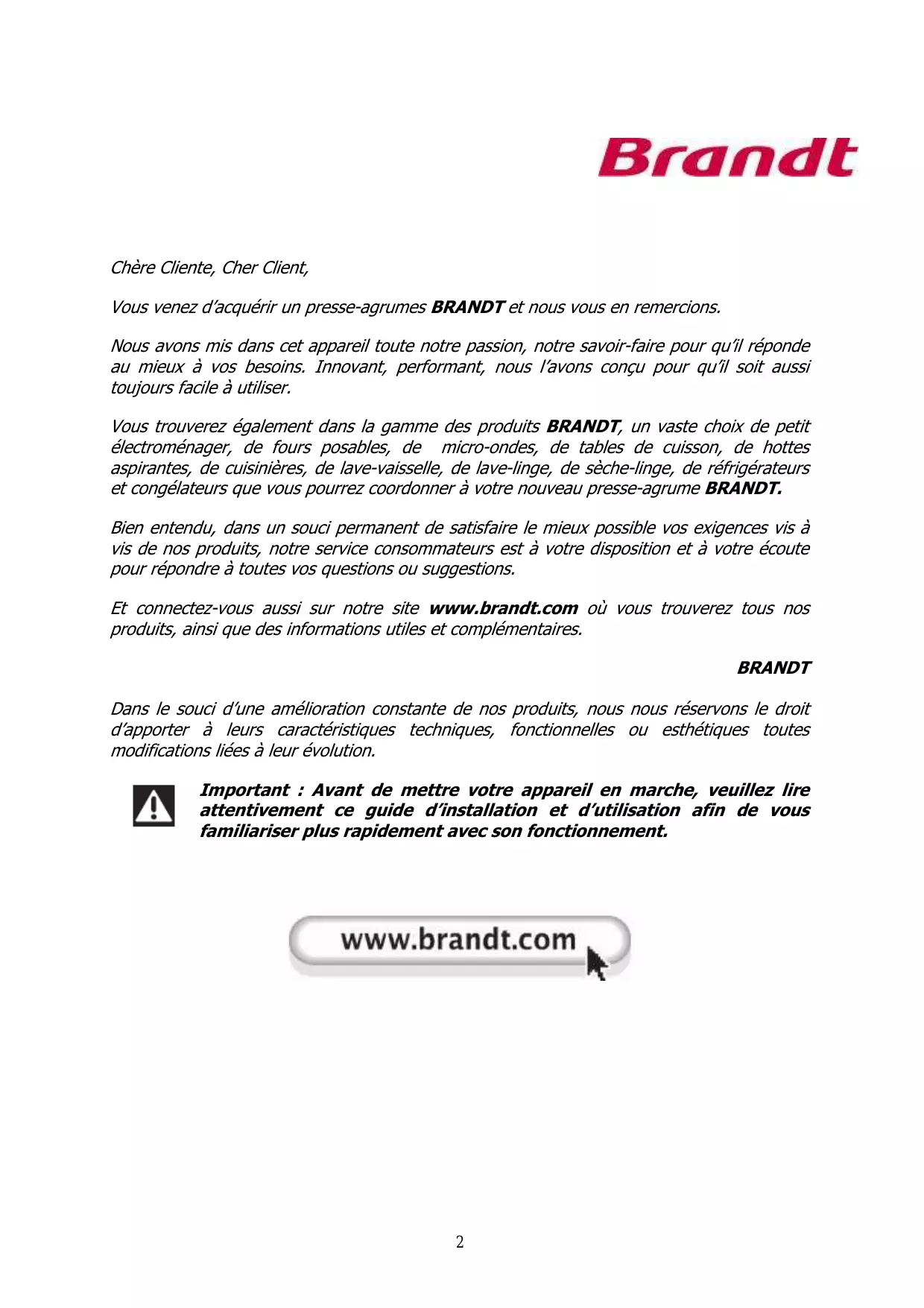 Et connectez-vous aussi sur notre site www.brandt.com où vous trouvez tous nos produits, ainsi que des informations utiles et complémentaires.
