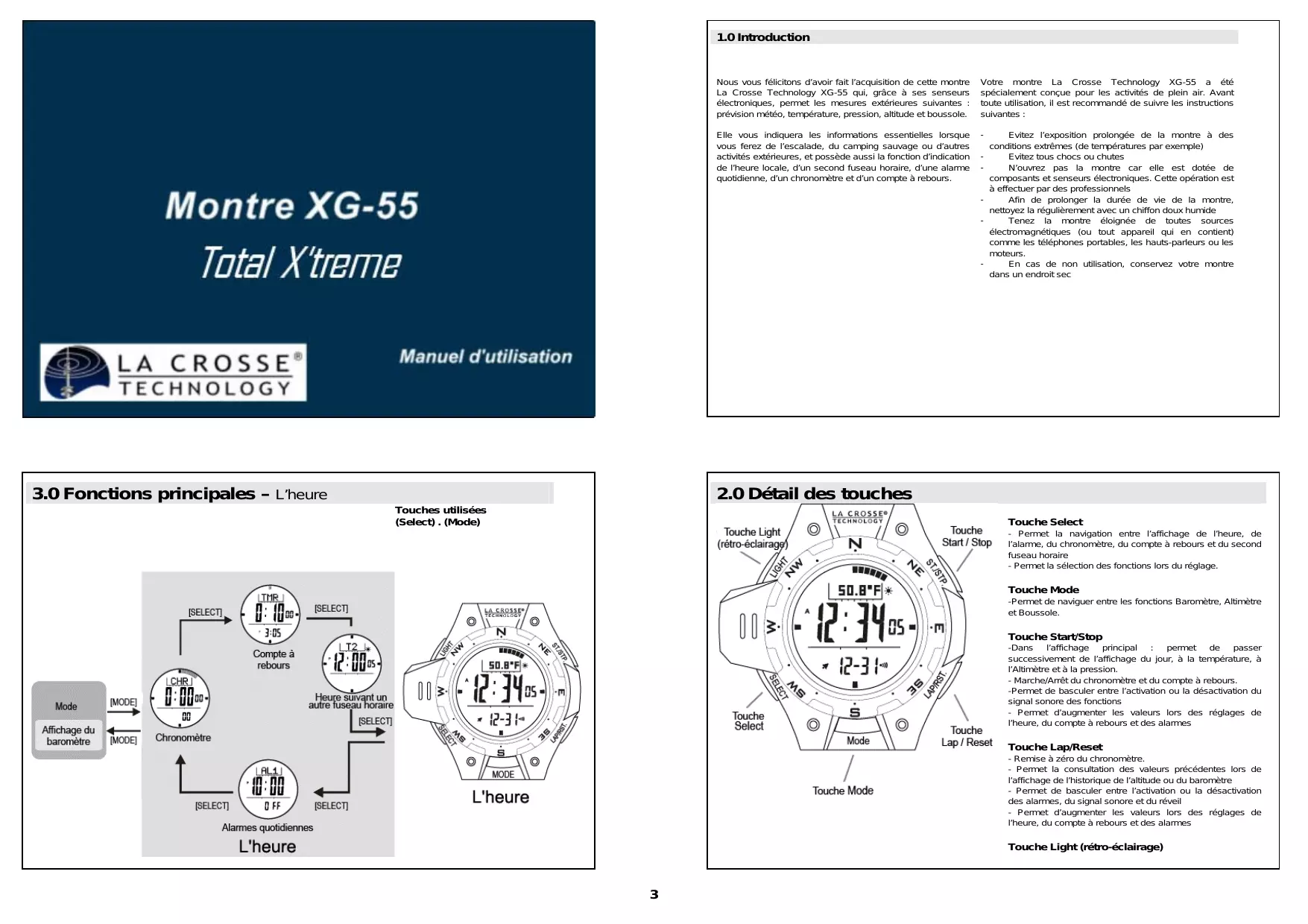 Nous vous félicitons d’avoir fait l’acquisition de cette montre La Crosse Technology XG-55 qui, grâce à ses senseurs électroniques, permet les mesures extérieures suivantes : prévision météo, température, pression, altitude et boussole. Votre montre La Crosse Technology XG-55 a été spécialement conçue pour les activités de plein air. Avant toute utilisation, il est recommandé de suivre les instructions suivantes : Elle vous indiquera les informations essentielles lorsque vous ferez de l’escalade, du camping sauvage ou d’autres activités extérieures, et possède aussi la fonction d’indication de l’heure locale, d’un second fuseau horaire, d’une alarme quotidienne, d’un chronomètre et d’un compte à rebours.
