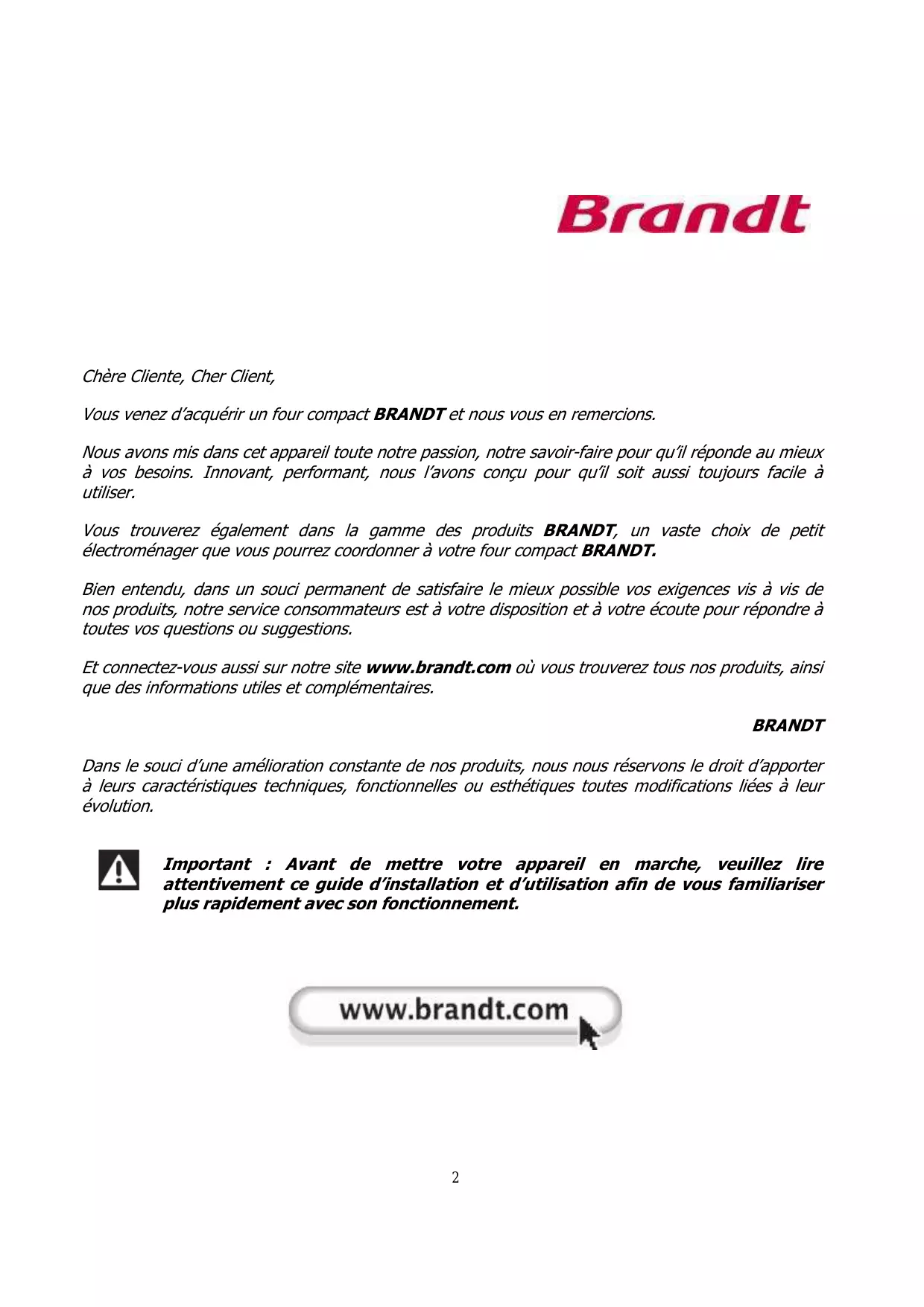 Chère Cliente, Cher Client, Vous venez d’acquérir un four compact BRANDT et nous vous en remercions. Nous avons mis dans cet appareil toute notre passion, notre savoir-faire pour qu’il réponde au mieux à vos besoins. Innovant, performant, nous l’avons conçu pour qu’il soit aussi toujours facile à utiliser. Vous trouverez également dans la gamme des produits BRANDT, un vaste choix de petit électroménager que vous pourrez coordonner à votre four compact BRANDT. Bien entendu, dans un souci permanent de satisfaire le mieux possible vos exigences vis à vis de nos produits, notre service consommateurs est à votre disposition et à votre écoute pour répondre à toutes vos questions ou suggestions. Et connectez-vous aussi sur notre site www.brandt.com où vous trouverez tous nos produits, ainsi que des informations utiles et complémentaires. BRANDT Dans le souci d’une amélioration constante de nos produits, nous nous réservons le droit d’apporter à leurs caractéristiques techniques, fonctionnelles ou esthétiques toutes modifications liées à leur évolution. Important : Avant de mettre votre appareil en marche, veuillez lire attentivement ce guide d’installation et d’utilisation afin de vous familiariser plus rapidement avec son fonctionnement.