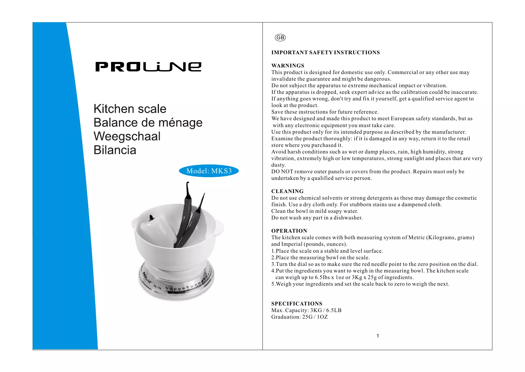 MK 3S BLANC - Balance de cuisine PROLINE - Notice d'utilisation et mode d'emploi gratuit
