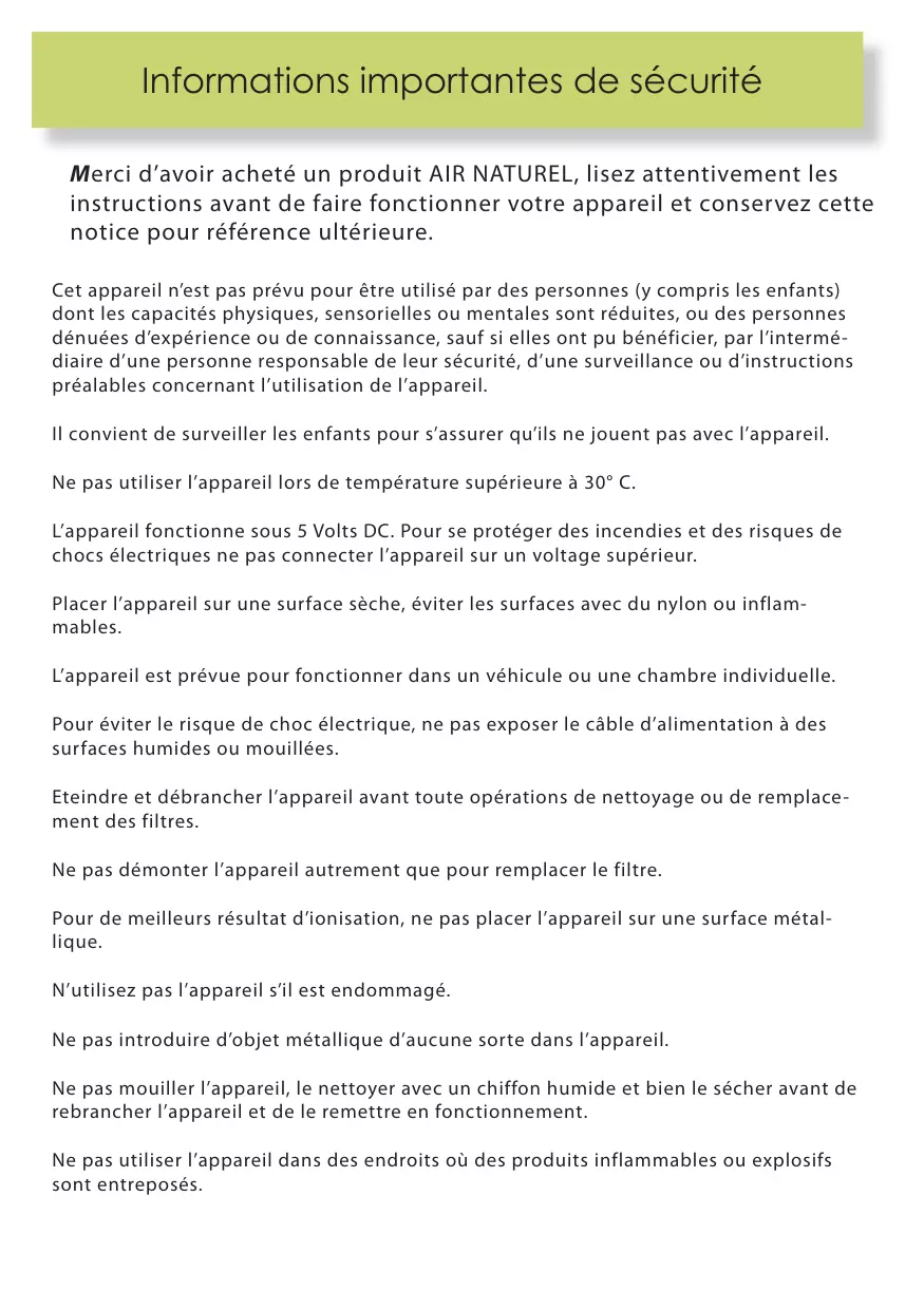 La sécurité de cet appareil est conforme aux règles techniques et aux normes en vigueur. Vérifiez que la tension du réseau correspond bien à celle indiquée sur l’appareil. Pour tout autre information et renseignement veuillez consulter notre site internet : www.airnaturel.com Conditions de garantie Les produits sont garantis pour une période d’un an à partir de la date d’achat (sur présentation de la facture du revendeur) contre toute défaillance résultant d’un vice de fabrication ou de matériau. Cette garantie ne couvre pas les vices ou dommages résultant d’une mauvaise installation, d’une utilisation incorrecte, ou de l’usure normale du produits. AIR NATUREL ne saurait être tenu responsable d’une mauvaise utilisation faite de ces produits, d’une utilisation qui s’avérerait dangereuse ou non appropriée. DEEE : Traitement des appareils électriques et électroniques en fin de vie ( applicable dans les pays de l’Union européen et aux autres pays européens disposant de systèmes de collectes appropriés). Ce symbole apposé sur le produit indique que ce produit ne doit pas être traité avec les déchets ménagers. Il doit être remis à un point de collecte approprié pour le recyclage des EEE (Equipements Electriques et Electromagnétiques). En s’assurant que ce produit est bien mis au rebus de manière appropriée, vous aiderez à prévenir les conséquences négatives potentielles pour l’environnement et la santé humaine. Le recyclage des matériaux aidera à conserver les ressources naturelles. Pour avoir des informations complémentaires au sujet du recyclage de ce produit, vous pouvez contacter votre municipalité, votre déchetterie ou votre magasin d’achat. Air Naturel info@airnaturel.com