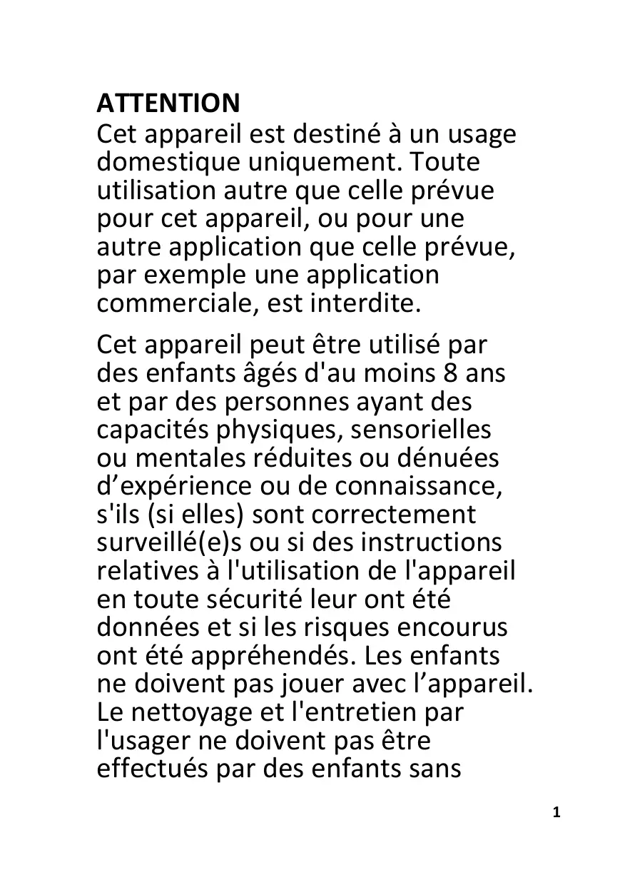 ATTENTION Cet appareil est destiné à un usage domestique uniquement. Toute utilisation autre que celle prévue pour cet appareil, ou pour une autre application que celle prévue, par exemple une application commerciale, est interdite. Cet appareil peut être utilisé par des enfants âgés d'au moins 8 ans et par des personnes ayant des capacités physiques, sensorielles ou mentales réduites ou dénuées d’expérience ou de connaissance, s'ils (si elles) sont correctement surveillé(e)s ou si des instructions relatives à l'utilisation de l'appareil en toute sécurité leur ont été données et si les risques encourus ont été appréhendés. Les enfants ne doivent pas jouer avec l’appareil. Le nettoyage et l'entretien par l'usager ne doivent pas être effectués par des enfants sans 1