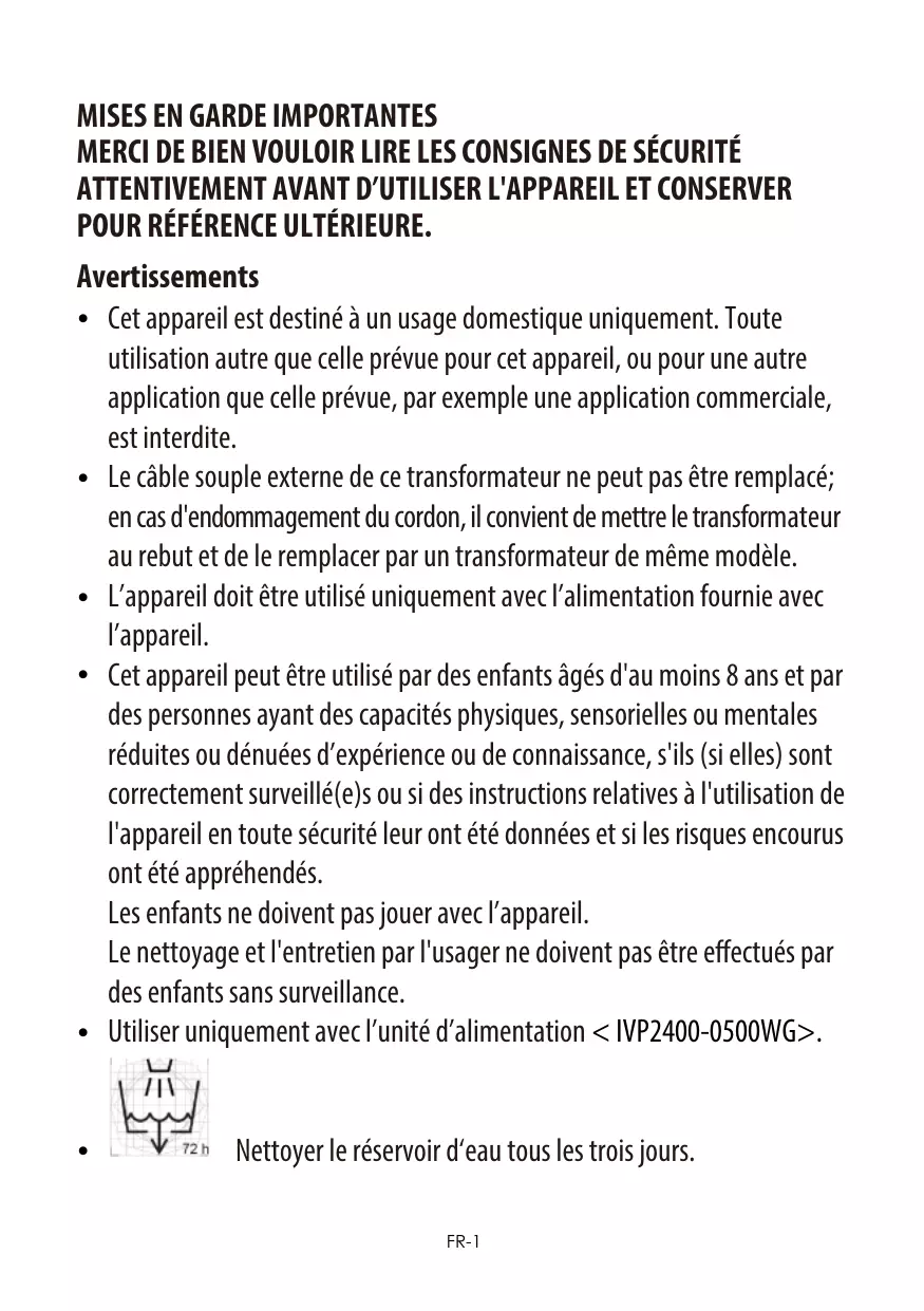 MERCI DE BIEN VOULOIR LIRE LES CONSIGNES DE SÉCURITÉ ATTENTIVEMENT AVANT D’UTILISER L'APPAREIL ET CONSERVER POUR RÉFÉRENCE ULTÉRIEURE. Avertissements Cet appareil est destiné à un usage domestique uniquement. Toute utilisation autre que celle prévue pour cet appareil, ou pour une autre application que celle prévue, par exemple une application commerciale, est interdite. Le câble souple externe de ce transformateur ne peut pas être remplacé; en cas d'endommagement du cordon, il convient de mettre le transformateur au rebut et de le remplacer par un transformateur de même modèle. L’appareil doit être utilisé uniquement avec l’alimentation fournie avec l’appareil. Cet appareil peut être utilisé par des enfants âgés d'au moins 8 ans et par des personnes ayant des capacités physiques, sensorielles ou mentales réduites ou dénuées d’expérience ou de connaissance, s'ils (si elles) sont correctement surveillé(e)s ou si des instructions relatives à l'utilisation de l'appareil en toute sécurité leur ont été données et si les risques encourus ont été appréhendés. Les enfants ne doivent pas jouer avec l’appareil. Le nettoyage et l'entretien par l'usager ne doivent pas être effectués par des enfants sans surveillance. Utiliser uniquement avec l’unité d’alimentation < IVP2400-0500WG>.