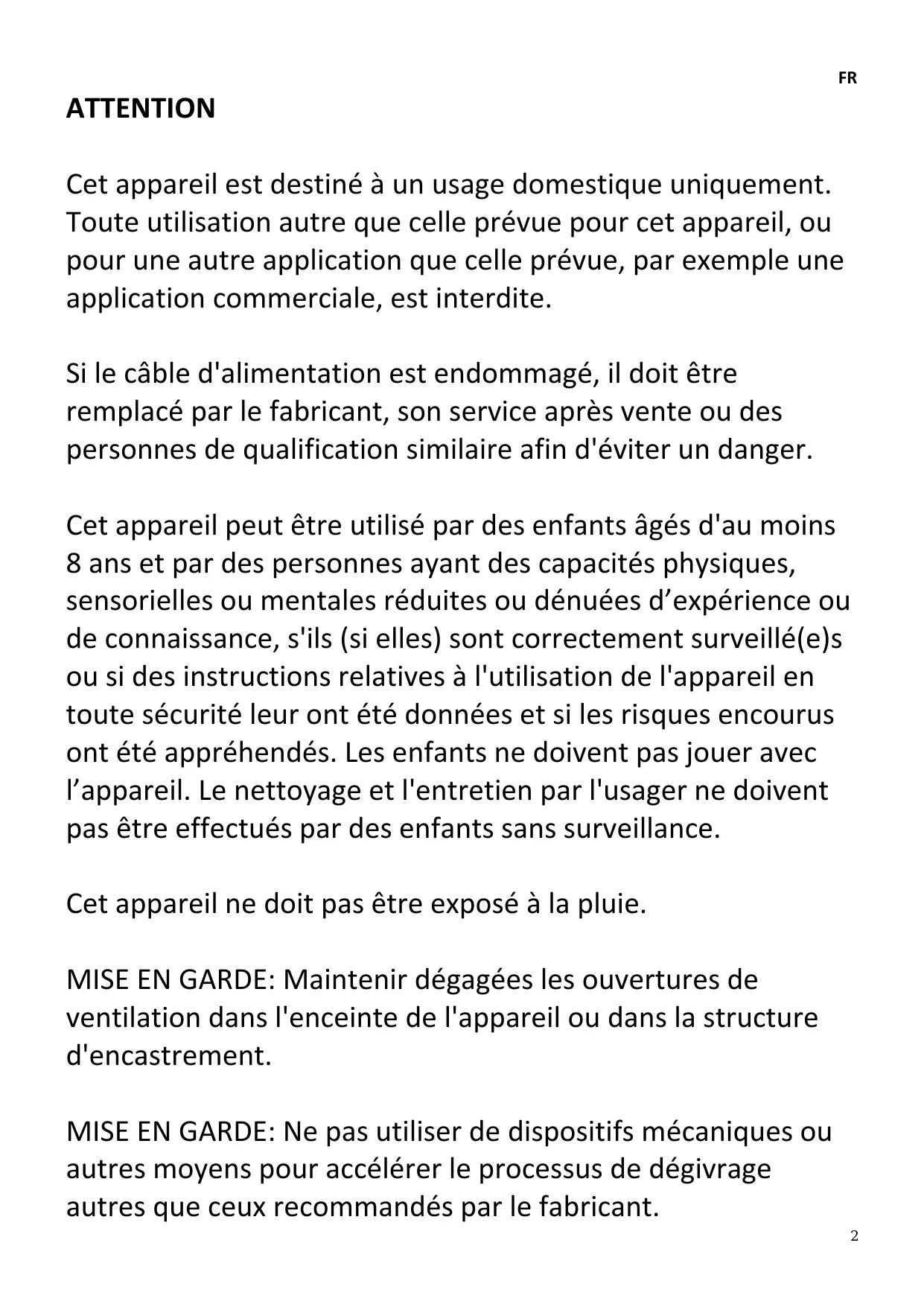 ATTENTION Cet appareil est destiné à un usage domestique uniquement. Toute utilisation autre que celle prévue pour cet appareil, ou pour une autre application que celle prévue, par exemple une application commerciale, est interdite. Si le câble d'alimentation est endommagé, il doit être remplacé par le fabricant, son service après vente ou des personnes de qualification similaire afin d'éviter un danger. Cet appareil peut être utilisé par des enfants âgés d'au moins 8 ans et par des personnes ayant des capacités physiques, sensorielles ou mentales réduites ou dénuées d’expérience ou de connaissance, s'ils (si elles) sont correctement surveillé(e)s ou si des instructions relatives à l'utilisation de l'appareil en toute sécurité leur ont été données et si les risques encourus ont été appréhendés. Les enfants ne doivent pas jouer avec l’appareil. Le nettoyage et l'entretien par l'usager ne doivent pas être effectués par des enfants sans surveillance. Cet appareil ne doit pas être exposé à la pluie. MISE EN GARDE: Maintenir dégagées les ouvertures de ventilation dans l'enceinte de l'appareil ou dans la structure d'encastrement. MISE EN GARDE: Ne pas utiliser de dispositifs mécaniques ou autres moyens pour accélérer le processus de dégivrage autres que ceux recommandés par le fabricant.