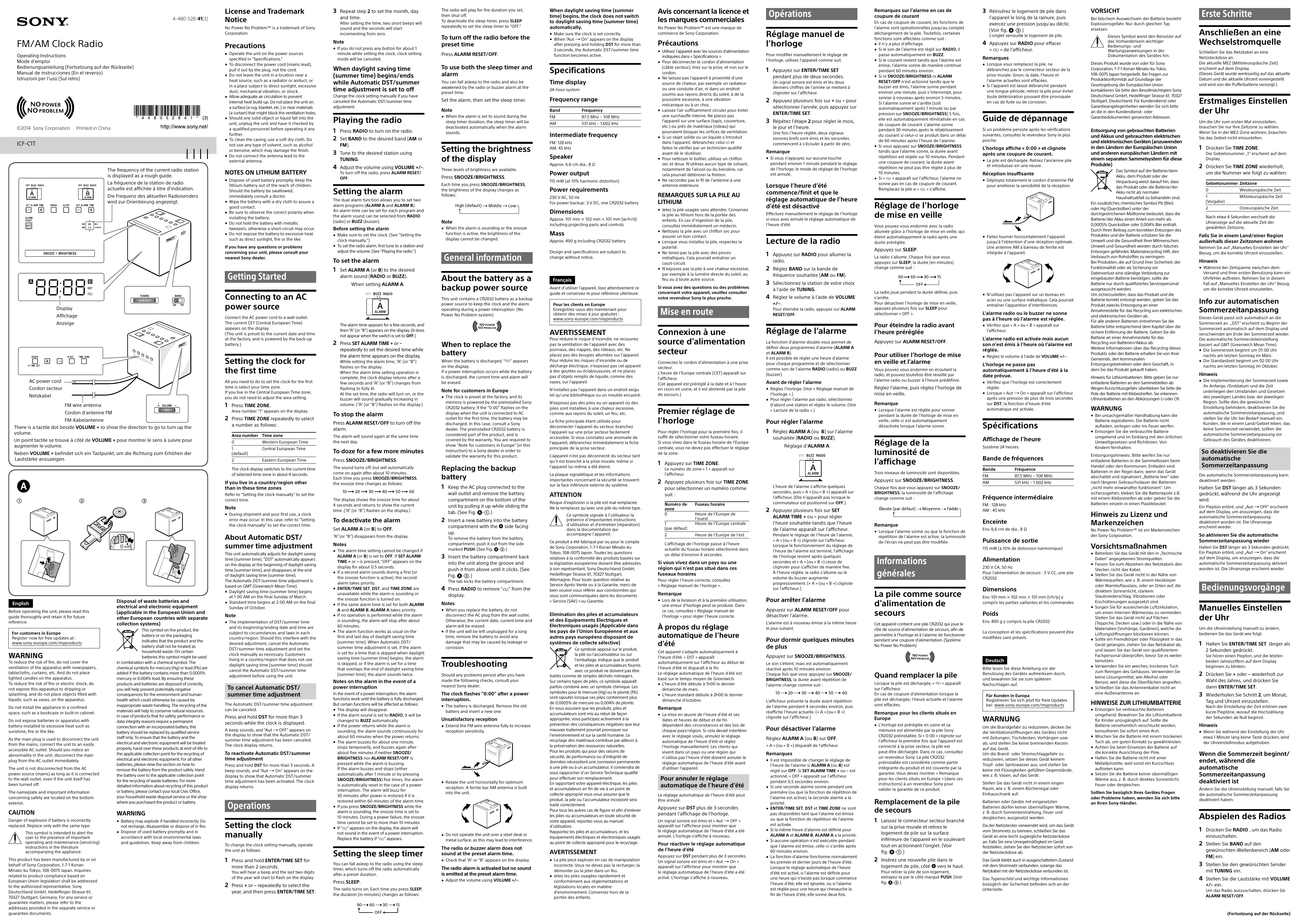 Téléchargez la notice de votre Radio Réveil au format PDF gratuitement ! Retrouvez votre notice iCFC1TR - SONY et reprennez votre appareil électronique en main. Sur cette page sont publiés tous les documents nécessaires à l'utilisation de votre appareil iCFC1TR de la marque SONY.