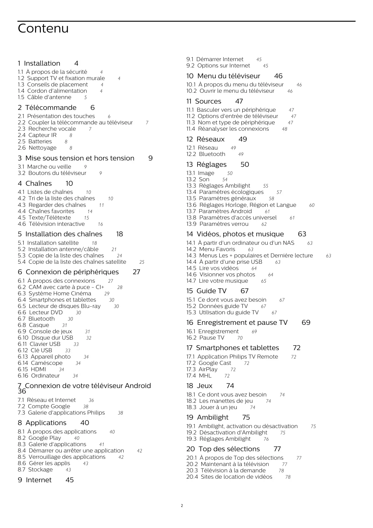 P W Paramètres Android 38 Paramètres écologiques 57 Pause TV 69 Photos, vidéos et musique 63 Pont hue 56 Problèmes, Chaînes 87 Problèmes, Connexion, Internet 88 Problèmes, Connexion, Wi-Fi 88 Problèmes, connexion HDMI 88 Problèmes, connexion USB 88 Problèmes, Image 87 Problèmes, langue du menu 88 Problèmes, Son 87 Problèmes, Télécommande 86 Programmes, Recommandations 77