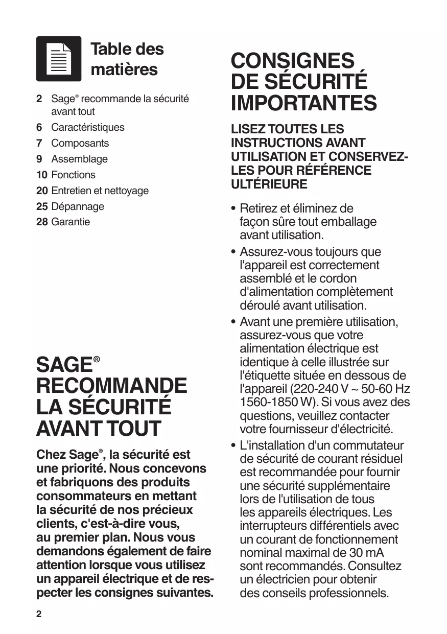 Chez Sage, la sécurité est une priorité. Nous concevons et fabriquons des produits consommateurs en mettant la sécurité de nos précieux clients, c'est-à-dire vous, au premier plan. Nous vous demandons également de faire attention lorsque vous utilisez un apparéil électrique et de respecter les consignes suivantes.