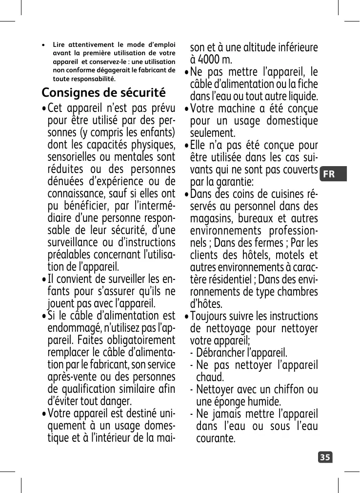à 4000 m. •Ne pas mettre l’appareil, le câble d’alimentation ou la fiche dans l’eau ou tout autre liquide. •Votre machine a été conçue pour un usage domestique seulement. •Elle n’a pas été conçue pour être utilisée dans les cas suivants qui ne sont pas couverts par la garantie: •Dans des coins de cuisines réservés au personnel dans des magasins, bureaux et autres environnements professionnels ; Dans des fermes ; Par les clients des hôtels, motels et autres environnements à caractère résidentiel ; Dans des environnements de type chambres d’hôtes. •Toujours suivre les instructions de nettoyage pour nettoyer votre appareil; - Débrancher l’appareil. - Ne pas nettoyer l’appareil chaud. - Nettoyer avec un chiffon ou une éponge humide. - Ne jamais mettre l’appareil dans l’eau ou sous l’eau courante.