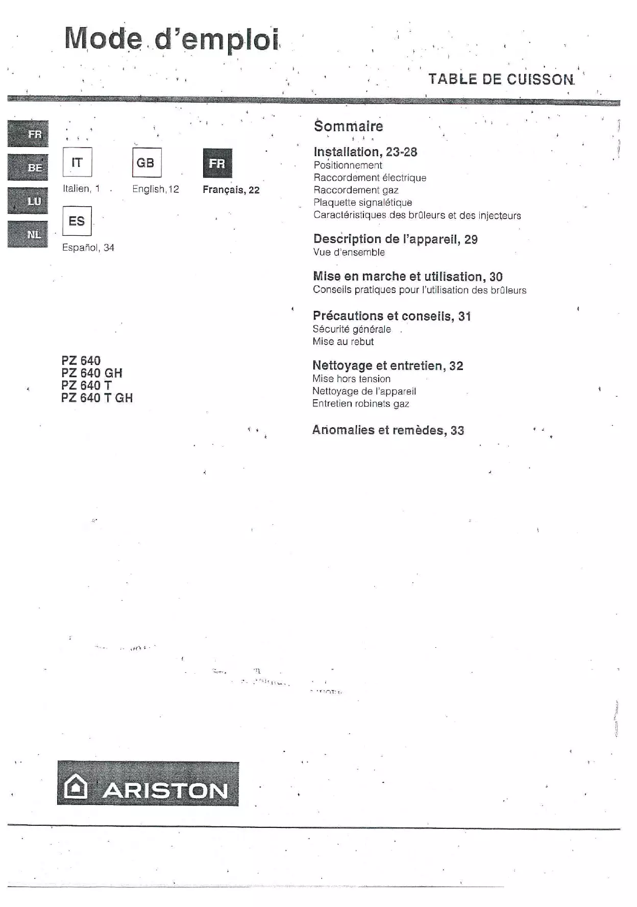 Retrouvez gratuitement la notice de l'appareil PZ 640 IX ARISTON au format PDF.