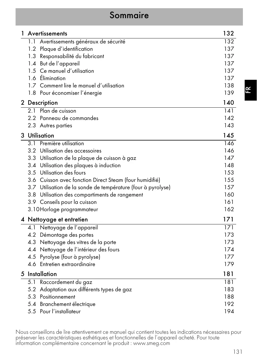 Ce manuel d’utilisation utilise les conventions de lecture suivantes : Avertissements Informations générales sur ce manuel d’utilisation, la sécurité et l’élimination finale. Description Description de l’appareil et de ses accessoires. Utilisation Informations sur l’utilisation de l’appareil et des accessoires, conseils de cuisson. Nettoyage et entretien Informations pour un nettoyage et un entretien corrects de l’appareil. Installation Informations pour le technicien qualifié concernant l’installation, la mise en fonction et l’essai. Avertissement de sécurité