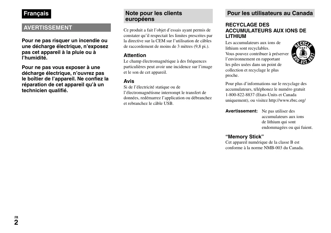 “Memory Stick” Cet appareil numérique de la classe B est conforme à la norme NMB-003 du Canada.