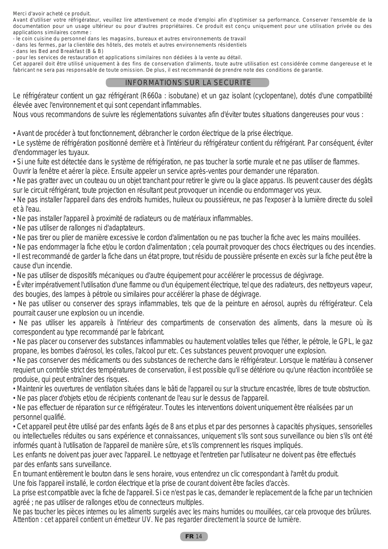 Avant d'utiliser votre réfrigérateur, veuillez lire attentivement ce mode d'emploi afin d'optimiser sa performance. Conserver l'ensemble de la documentation pour un usage ultérieur ou pour d'autres propriétaires. Ce produit est conçu uniquement pour une utilisation privée ou des applications similaires comme :
