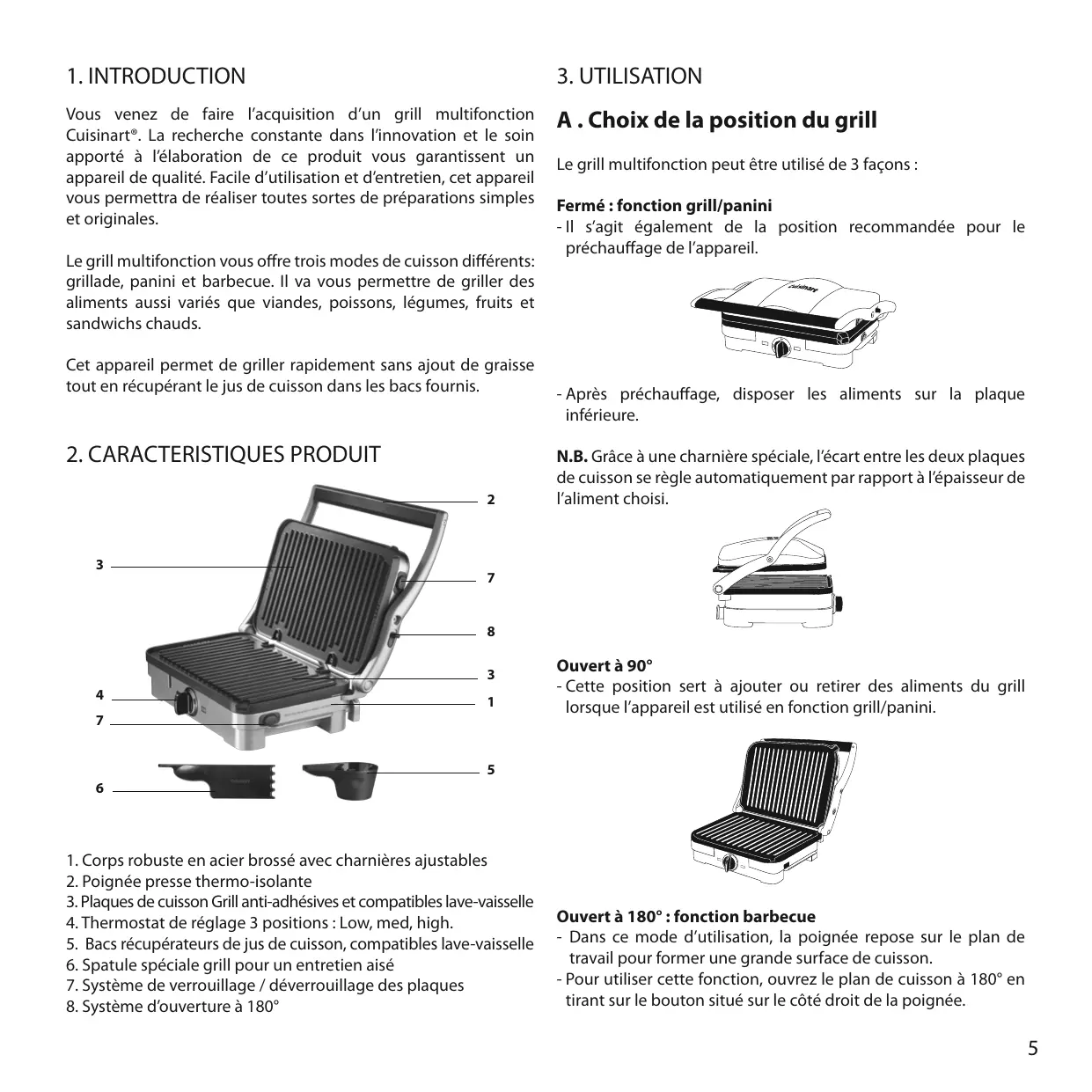 Vous venez de faire l’acquisition d’un grill multifonction Cuisinart®. La recherche constante dans l’innovation et le soin apporté à l’élaboration de ce produit vous garantissent un appareil de qualité. Facile d’utilisation et d’entretien, cet appareil vous permettra de réaliser toutes sortes de préparations simples et originales. A . Choix de la position du grill Le grill multifonction vous offre trois modes de cuisson différents: grillade, panini et barbecue. Il va vous permettre de griller des aliments aussi variés que viandes, poissons, légumes, fruits et sandwichs chauds. Cet appareil permet de griller rapidement sans ajout de graisse tout en récupérant le jus de cuisson dans les bacs fournis.