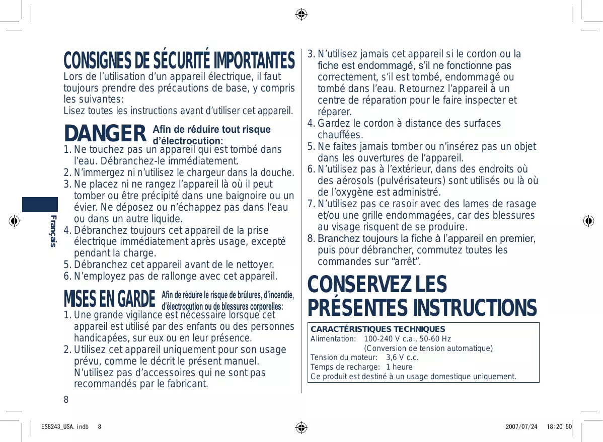 CONSERVEZ LES PRÉSENTES INSTRUCTIONS CARACTÉRISTIQUES TECHNIQUES Alimentation: 100-240 V c.a., 50-60 Hz (Conversion de tension automatique) Tension du moteur: 3,6 V c.c. Temps de recharge: 1 heure Ce produit est destiné à un usage domestique uniquement.