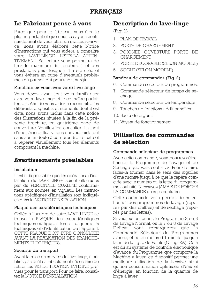 Avertissements préalables Installation Il est indispensable que les opérations d’installation du LAVE-LINGE soient effectuées par du PERSONNEL QUALIFIE conformément aux normes en vigueur. Les instructions spécifiques d’installation sont indiquées dans la NOTICE D’INSTALLATION. Plaque des caractéristiques techniques Collée à l’arrière de votre LAVE-LINGE se trouve la PLAQUE des carac-téristiques techniques où figurent les renseignements techniques et d’identification de l’appareil. CETTE PLAQUE DOIT ETRE CONSULTEE AVANT LA REALISATION DES BRANCHEMENTS ELECTRIQUES. Sécurité de transport Avant la mise en service du lave-linge, n’oubliez pas qu’il est absolument nécessaire de retirer les VIS DE FIXATION INTERNE prévues pour le transport. Pour ce faire, consultez la NOTICE D’INSTALLATION.
