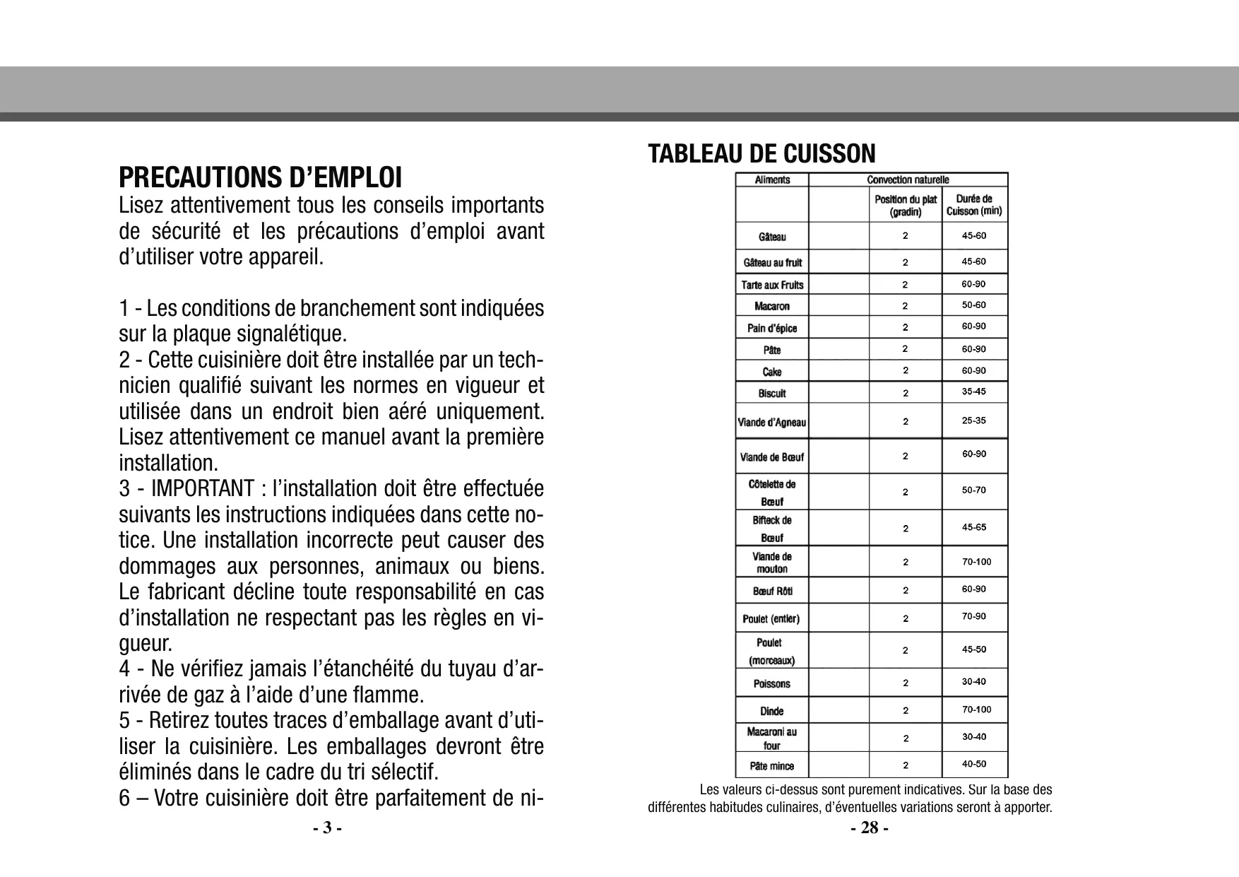 TABLEAU DE CUISSON 28
