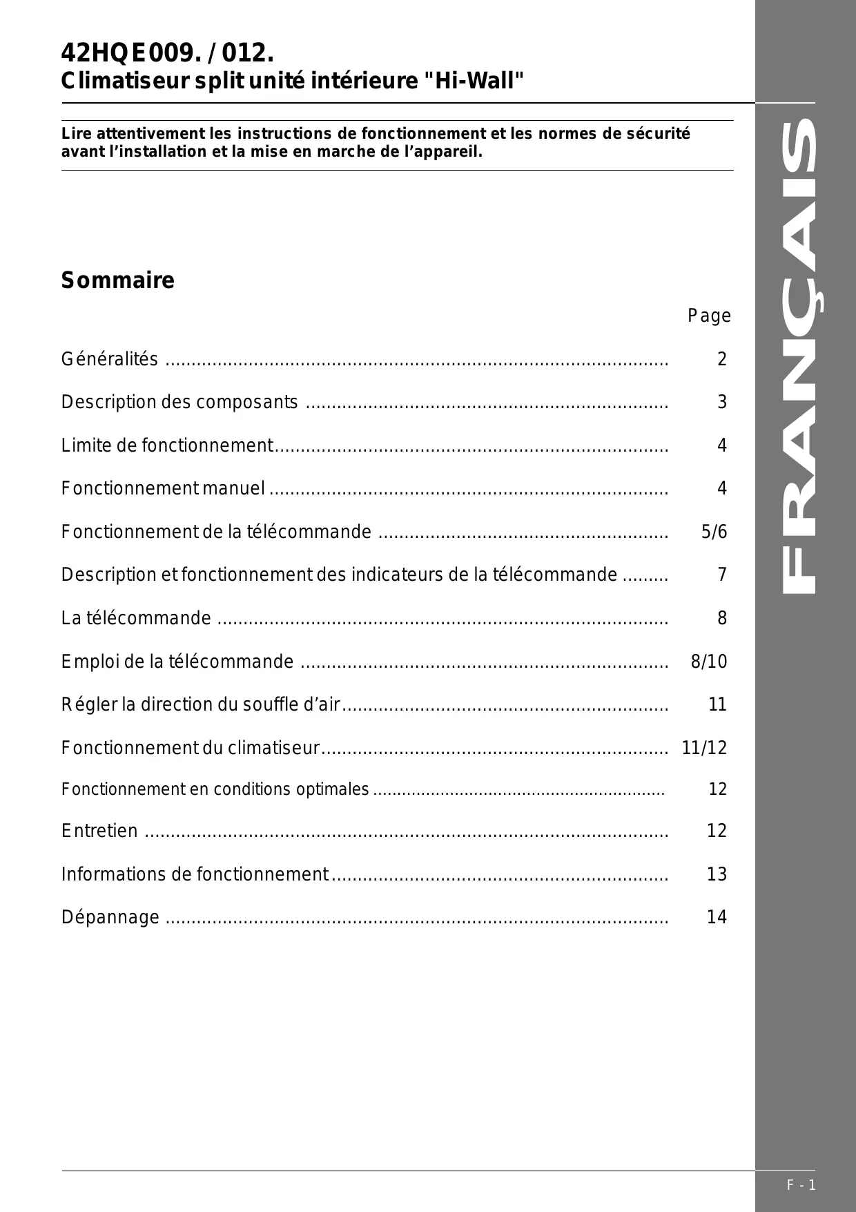 F-1 42HQE009. / 012. Généralités Lire attentivement ce manuel Ce manuel contient de nombreux conseils pour un emploi et un entretien corrects du climatiseur. Il suffit de manipuler le climatiseur avec précaution pour gagner du temps et de l’argent et s’assurer une longue durée de vie. Le tableau du "DÉPANNAGE" offre de nombreuses solutions des problèmes les plus communs. Il est recommandé de consulter le tableau du Dépannage avant de s’adresser au service après-vente. ATTENTION !