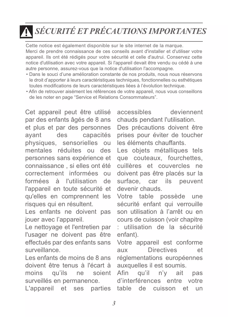 accessibles deviennent chauds pendant l'utilisation. Des précautions doivent être prises pour éviter de toucher les éléments chauffants. Les objets métalliques tels que couteaux, fourchettes, cuillères et couvercles ne doivent pas être placés sur la surface, car ils peuvent devenir chauds. Votre table possède une sécurité enfant qui verrouille son utilisation à l’arrêt ou en cours de cuisson (voir chapitre : utilisation de la sécurité enfant). Votre appareil est conforme aux Directives et réglementations européennes auxquelles il est soumis. Afin qu’il n’y ait pas d’interférences entre votre table de cuisson et un 3
