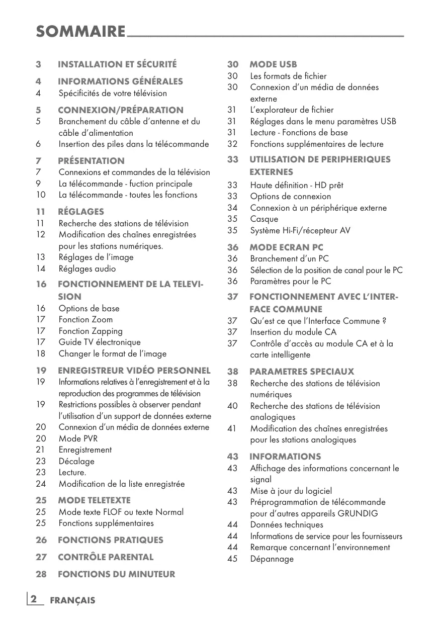 PARAMETRES SPECIAUX Recherche des stations de télévision numériques Recherche des stations de télévision analogiques Modification des chaînes enregistrées pour les stations analogiques Informations Affichage des informations concernant le signal Mise à jour du logiciel Préprogrammation de télécommande pour d’autres appareils GRUNDIG Données techniques Informations de service pour les fournisseurs Remarque concernant l’environnement Dépannage