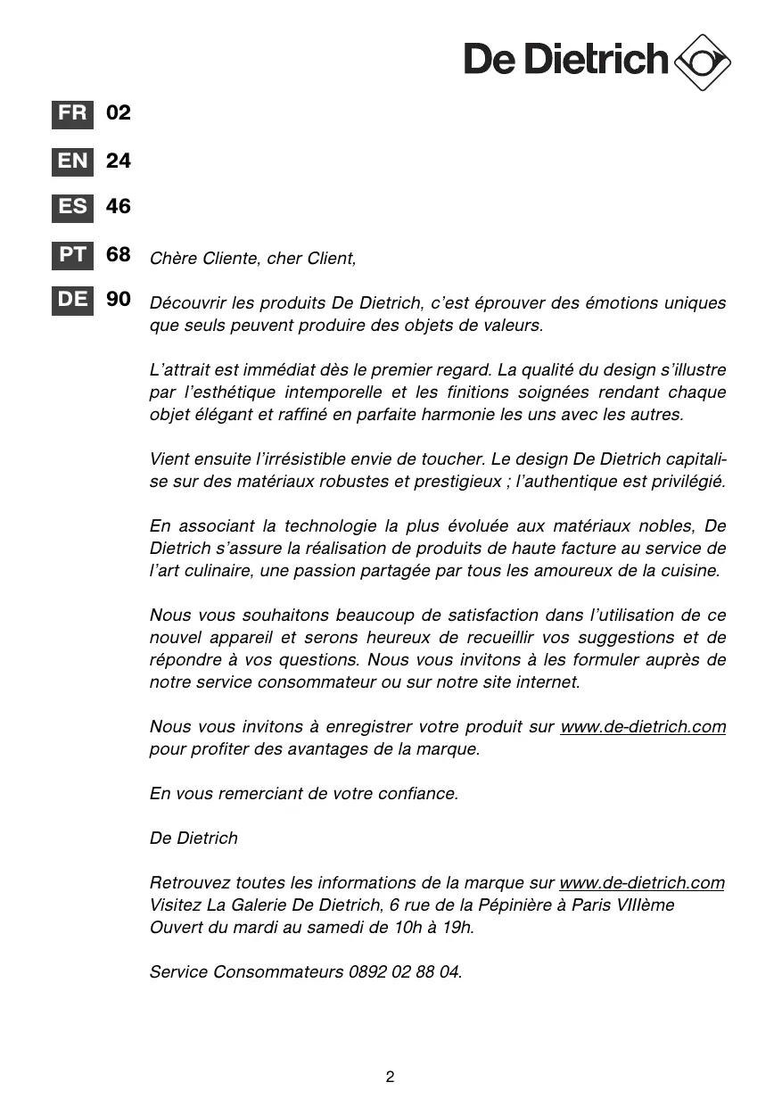 EN 24 ES 46 PT 68 Chère Cliente, cher Client, DE 90 Découvrir les produits De Dietrich, c’est éprouver des émotions uniques que seuls peuvent produire des objets de valeurs. L’attrait est immédiat dès le premier regard. La qualité du design s’illustre par l’esthétique intemporelle et les finitions soignées rendant chaque objet élégant et raffiné en parfaite harmonie les uns avec les autres. Vient ensuite l’irrésistible envie de toucher. Le design De Dietrich capitalise sur des matériaux robustes et prestigieux ; l’authentique est privilégié. En associant la technologie la plus évoluée aux matériaux nobles, De Dietrich s’assure la réalisation de produits de haute facture au service de l’art culinaire, une passion partagée par tous les amoureux de la cuisine. Nous vous souhaitons beaucoup de satisfaction dans l’utilisation de ce nouvel appareil et serons heureux de recueillir vos suggestions et de répondre à vos questions. Nous vous invitons à les formuler auprès de notre service consommateur ou sur notre site internet. Nous vous invitons à enregistrer votre produit sur www.de-dietrich.com pour profiter des avantages de la marque. En vous remerciant de votre confiance. De Dietrich Retrouvez toutes les informations de la marque sur www.de-dietrich.com Visitez La Galerie De Dietrich, 6 rue de la Pépinière à Paris VIIIème Ouvert du mardi au samedi de 10h à 19h. Service Consommateurs 0892 02 88 04.