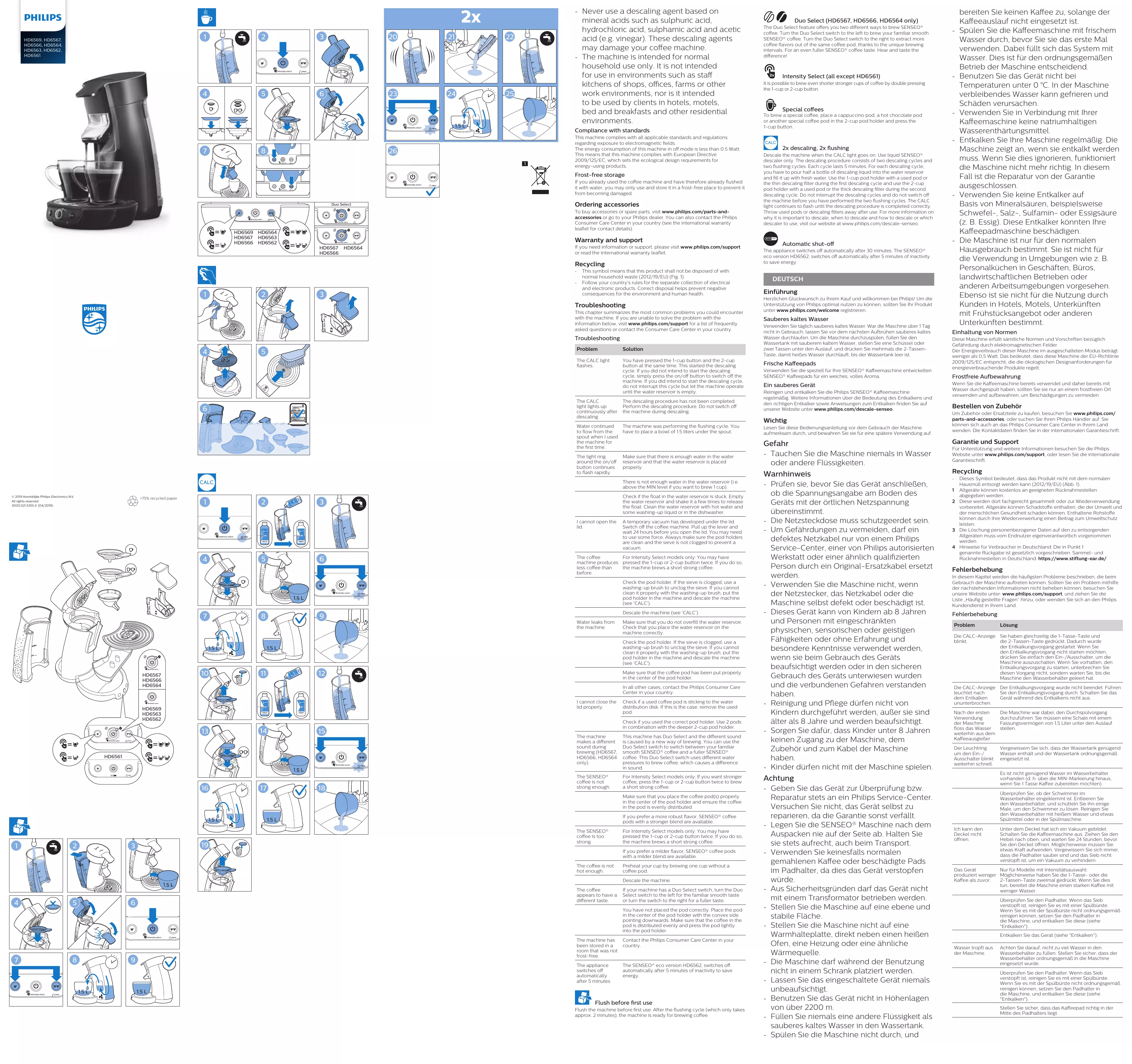 5 minutes. Pour chaque cycle de détartrage, vous devez verser la moitié d‘un flacon de liquide de détartrage dans le réservoir d‘eau et le remplir avec de l‘eau fraîche. Utilisez le porte-dosette pour 1 tasse avec une dosette usagée ou le filtre de détartrage fin lors du premier cycle de détartrage et le porte-dosette pour 2 tasses avec une dosette usagée ou le filtre de détartrage épais pendant le deuxième cycle de détartrage. N’interrompez pas les cycles de détartrage et n’éteignez pas la machine avant la fin des deux cycles de rinçage. Le voyant CALC continue de clignoter jusqu’à ce que la procédure de détartrage soit terminée correctement. Jetez les dosettes ou les filtres de détartrage usagés après utilisation. Pour plus d’informations sur l’importance du détartrage, sur quand et comment procéder au détartrage et sur le détartrant à utiliser, consultez notre site Web à l’adresse www.philips.com/descale-senseo.