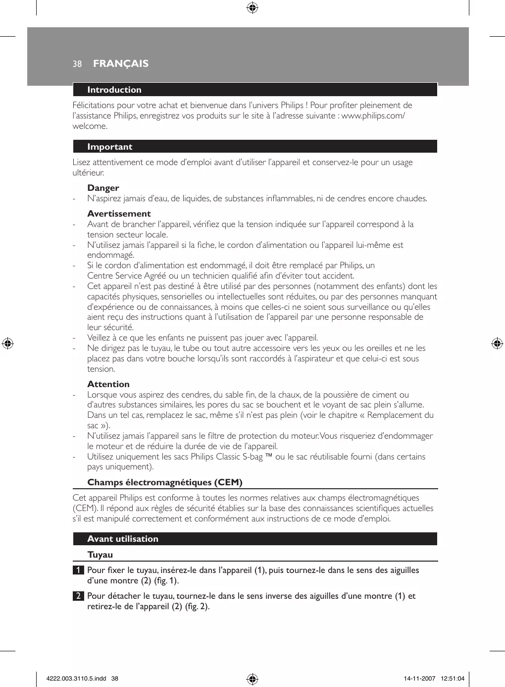Si le cordon d’alimentation est endommagé, il doit être remplacé par Philips, un Centre Service Agréé ou un technicien qualifié afin d’éviter tout accident. Cet appareil n’est pas destiné à être utilisé par des personnes (notamment des enfants) dont les capacités physiques, sensorielles ou intellectuelles sont réduites, ou par des personnes manquant d’expérience ou de connaissances, à moins que celles-ci ne soient sous surveillance ou qu’elles aient reçu des instructions quant à l’utilisation de l’appareil par une personne responsable de leur sécurité. Veillez à ce que les enfants ne puissent pas jouer avec l’appareil. Ne dirigez pas le tuyau, le tube ou tout autre accessoire vers les yeux ou les oreilles et ne les placez pas dans votre bouche lorsqu’ils sont raccordés à l’aspirateur et que celui-ci est sous tension. Attention Lorsque vous aspirez des cendres, du sable fin, de la chaux, de la poussière de ciment ou d’autres substances similaires, les pores du sac se bouchent et le voyant de sac plein s’allume. Dans un tel cas, remplacez le sac, même s’il n’est pas plein (voir le chapitre « Remplacement du sac »). N’utilisez jamais l’appareil sans le filtre de protection du moteur. Vous risqueriez d’endommager le moteur et de réduire la durée de vie de l’appareil. Utilisez uniquement les sacs Philips Classic S-bag ` ou le sac réutilisable fourni (dans certains pays uniquement). Champs électromagnétiques (CEM)
