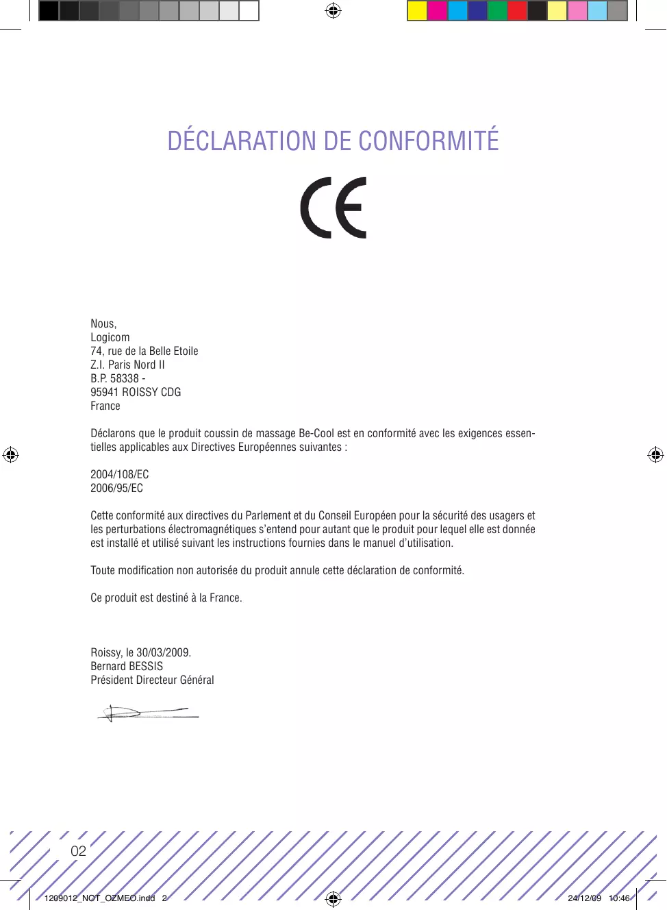Déclarons que le produit coussin de massage Be-Cool est en conformité avec les exigences essentielles applicables aux Directives Européennes suivantes :