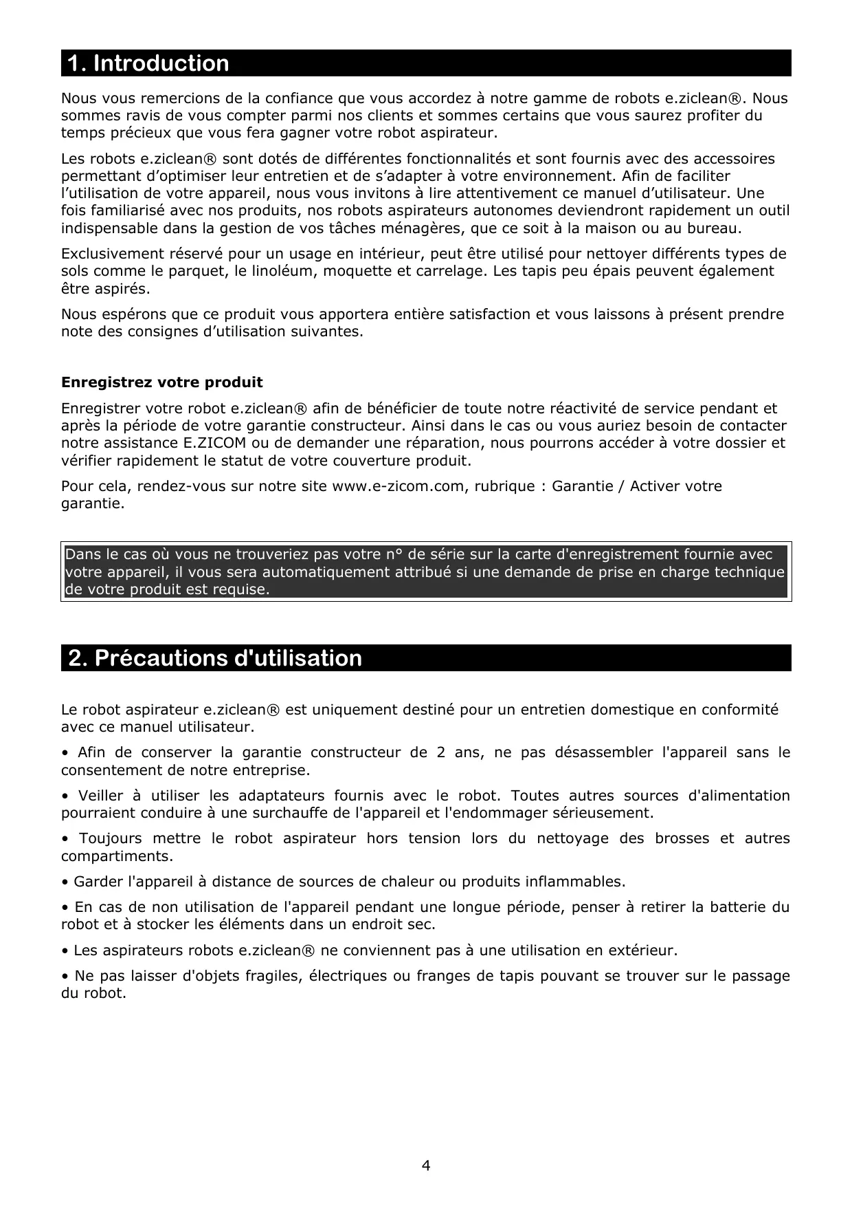 Nous vous remercions de la confiance que vous accordez à notre gamme de robots e.ziclean®. Nous sommes ravis de vous compter parmi nos clients et sommes certains que vous saurez profiter du temps précieux que vous fera gagner votre robot aspirateur. Les robots e.ziclean® sont dotés de différentes fonctionnalités et sont fournis avec des accessoires permettant d’optimiser leur entretien et de s’adapter à votre environnement. Afin de faciliter l’utilisation de votre appareil, nous vous invitons à lire attentivement ce manuel d’utilisateur. Une fois familiarisé avec nos produits, nos robots aspirateurs autonomes deviendront rapidement un outil indispensable dans la gestion de vos tâches ménagères, que ce soit à la maison ou au bureau. Exclusivement réservé pour un usage en intérieur, peut être utilisé pour nettoyer différents types de sols comme le parquet, le linoléum, moquette et carrelage. Les tapis peu épais peuvent également être aspirés. Nous espérons que ce produit vous apportera entière satisfaction et vous laissons à présent prendre note des consignes d’utilisation suivantes. Enregistrez votre produit Enregistrer votre robot e.ziclean® afin de bénéficier de toute notre réactivité de service pendant et après la période de votre garantie constructeur. Ainsi dans le cas ou vous auriez besoin de contacter notre assistance E.ZICOM ou de demander une réparation, nous pourrons accéder à votre dossier et vérifier rapidement le statut de votre couverture produit. Pour cela, rendez-vous sur notre site www.e-zicom.com, rubrique : Garantie / Activer votre garantie. Dans le cas où vous ne trouveriez pas votre n° de série sur la carte d'enregistrement fournie avec votre appareil, il vous sera automatiquement attribué si une demande de prise en charge technique de votre produit est requise.
