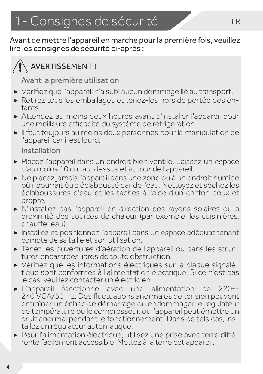 Avant de mettre l’appareil en marche pour la première fois, veuillez lire les consignes de sécurité ci-après : AVERTISSEMENT ! Avant la première utilisation ▶▶ Vérifiez que l’appareil n’a subi aucun dommage lié au transport. ▶▶ Retirez tous les emballages et tenez-les hors de portée des enfants. ▶▶ Attendez au moins deux heures avant d'installer l'appareil pour une meilleure efficacité du système de réfrigération. ▶▶ Il faut toujours au moins deux personnes pour la manipulation de l’appareil car il est lourd. Installation ▶▶ Placez l'appareil dans un endroit bien ventilé. Laissez un espace d'au moins 10 cm au-dessus et autour de l'appareil. ▶▶ Ne placez jamais l'appareil dans une zone ou à un endroit humide où il pourrait être éclaboussé par de l'eau. Nettoyez et séchez les éclaboussures d'eau et les tâches à l'aide d'un chiffon doux et propre. ▶▶ N'installez pas l'appareil en direction des rayons solaires ou à proximité des sources de chaleur (par exemple, les cuisinières, chauffe-eau). ▶▶ Installez et positionnez l'appareil dans un espace adéquat tenant compte de sa taille et son utilisation. ▶▶ Tenez les ouvertures d’aération de l'appareil ou dans les structures encastrées libres de toute obstruction. ▶▶ Vérifiez que les informations électriques sur la plaque signalétique sont conformes à l'alimentation électrique. Si ce n'est pas le cas, veuillez contacter un électricien. ▶▶ L’appareil fonctionne avec une alimentation de 220~240 VCA/50 Hz. Des fluctuations anormales de tension peuvent entraîner un échec de démarrage ou endommager le régulateur de température ou le compresseur, ou l'appareil peut émettre un bruit anormal pendant le fonctionnement. Dans de tels cas, installez un régulateur automatique. ▶▶ Pour l'alimentation électrique, utilisez une prise avec terre différente facilement accessible. Mettez à la terre cet appareil.