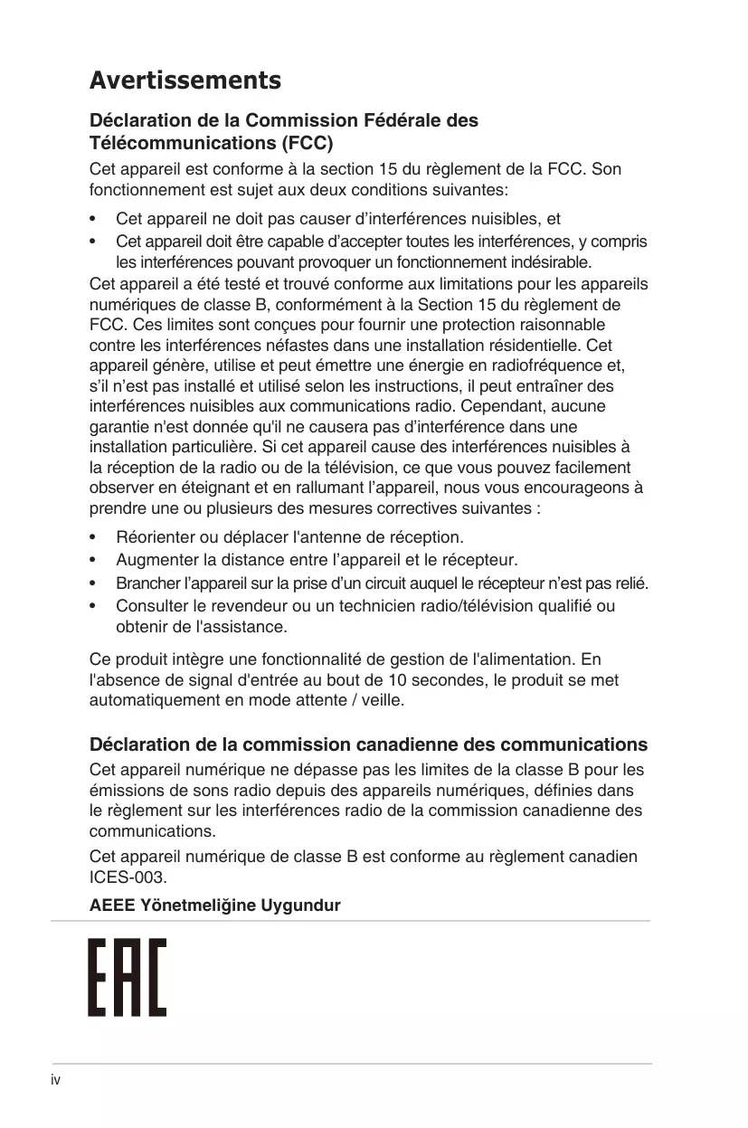 Réorienter ou déplacer l'antenne de réception. Augmenter la distance entre l’appareil et le récepteur. Brancher l’appareil sur la prise d’un circuit auquel le récepteur n’est pas relié. Consulter le revendeur ou un technicien radio/télévision qualifié ou obtenir de l'assistance. Ce produit intègre une fonctionnalité de gestion de l'alimentation. En l'absence de signal d'entrée au bout de 10 secondes, le produit se met automatiquement en mode attente / veille. Déclaration de la commission canadienne des communications Cet appareil numérique ne dépasse pas les limites de la classe B pour les émissions de sons radio depuis des appareils numériques, définies dans le règlement sur les interférences radio de la commission canadienne des communications. Cet appareil numérique de classe B est conforme au règlement canadien ICES-003. AEEE Yönetmeliğine Uygundur