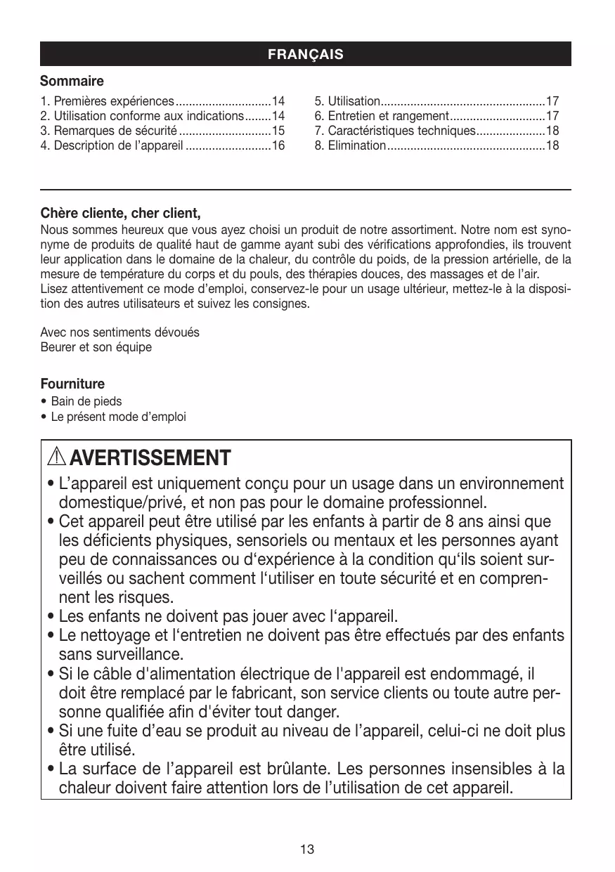 Cet appareil est exclusivement destiné au soin de vos pieds. AVERTISSEMENT N’utilisez pas le bain de pieds