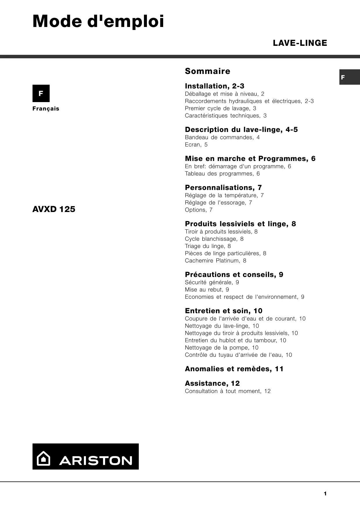 Installation, 2-3 Déballage et mise à niveau, 2 Raccordements hydrauliques et électriques, 2-3 Premier cycle de lavage, 3 Caractéristiques techniques, 3 Description du lave-linge, 4-5 Bandeau de commandes, 4 Ecran, 5 Mise en marche et Programmes, 6 En bref: démarrage d'un programme, 6 Tableau des programmes, 6 Personnalisations, 7 AVXD 125 Réglage de la température, 7 Réglage de l'essorage, 7 Options, 7 Produits lessiviels et linge, 8 Tiroir à produits lessiviels, 8 Cycle blanchissage, 8 Triage du linge, 8 Pièces de linge particulières, 8 Cachemire Platinum, 8 Précautions et conseils, 9 Sécurité générale, 9 Mise au rebut, 9 Economies et respect de l'environnement, 9 Entretien et soin, 10 Coupure de l'arrivée d'eau et de courant, 10 Nettoyage du lave-linge, 10 Nettoyage du tiroir à produits lessiviels, 10 Entretien du hublot et du tambour, 10 Nettoyage de la pompe, 10 Contrôle du tuyau d'arrivée de l'eau, 10 Anomalies et remèdes, 11 Assistance, 12 Consultation à tout moment, 12