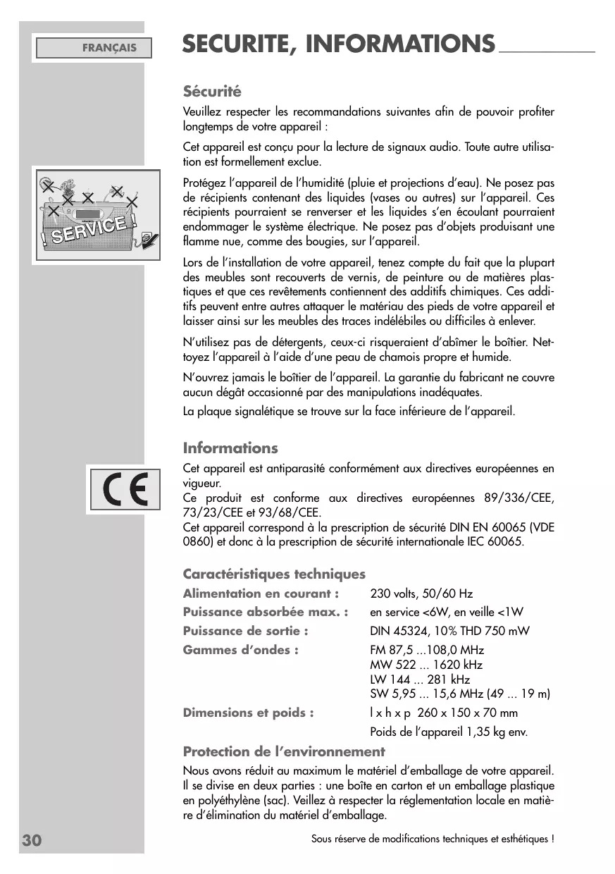 FRANÇAIS SECURITE, INFORMATIONS _______________ Sécurité Veuillez respecter les recommandations suivantes afin de pouvoir profiter longtemps de votre appareil : Cet appareil est conçu pour la lecture de signaux audio. Toute autre utilisation est formellement exclue.