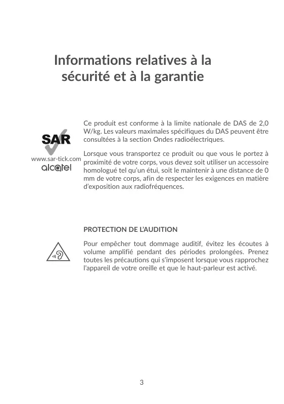 Informations relatives à la sécurité et à la garantie Ce produit est conforme à la limite nationale de DAS de 2,0 W/kg. Les valeurs maximales spécifiques du DAS peuvent être consultées à la section Ondes radioélectriques. www.sar-tick.com Lorsque vous transportez ce produit ou que vous le portez à proximité de votre corps, vous devez soit utiliser un accessoire homologué tel qu’un étui, soit le maintenir à une distance de 0 mm de votre corps, afin de respecter les exigences en matière d’exposition aux radiofréquences.