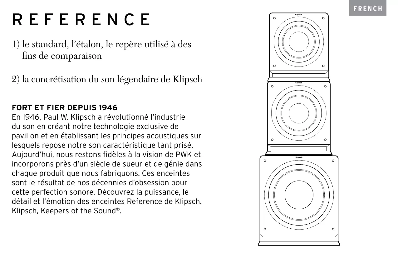 FORT ET FIER DEPUIS 1946 En 1946, Paul W. Klipsch a révolutionné l’industrie du son en créant notre technologie exclusive de pavillon et en établissant les principes acoustiques sur lesquels repose notre son caractéristique tant prisé. Aujourd’hui, nous restons fidèles à la vision de PWK et incorporons près d’un siècle de sueur et de génie dans chaque produit que nous fabriquons. Ces enceintes sont le résultat de nos décennies d’obsession pour cette perfection sonore. Découvrez la puissance, le détail et l’émotion des enceintes Reference de Klipsch. Klipsch, Keepers of the Sound®.