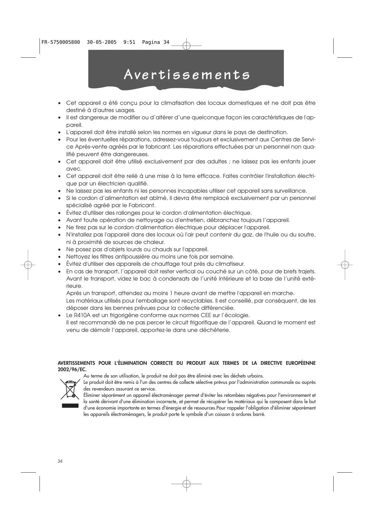 Av e r t i s s e m e n t s • Cet appareil a été conçu pour la climatisation des locaux domestiques et ne doit pas être destiné à d'autres usages. • Il est dangereux de modifier ou d’altérer d’une quelconque façon les caractéristiques de l'appareil. • L'appareil doit être installé selon les normes en vigueur dans le pays de destination. • Pour les éventuelles réparations, adressez-vous toujours et exclusivement aux Centres de Service Après-vente agréés par le fabricant. Les réparations effectuées par un personnel non qualifié peuvent être dangereuses. • Cet appareil doit être utilisé exclusivement par des adultes ; ne laissez pas les enfants jouer avec. • Cet appareil doit être relié à une mise à la terre efficace. Faites contrôler l'installation électrique par un électricien qualifié. • Ne laissez pas les enfants ni les personnes incapables utiliser cet appareil sans surveillance. • Si le cordon d’alimentation est abîmé, il devra être remplacé exclusivement par un personnel spécialisé agréé par le Fabricant. • Évitez d'utiliser des rallonges pour le cordon d'alimentation électrique. • Avant toute opération de nettoyage ou d'entretien, débranchez toujours l’appareil. • Ne tirez pas sur le cordon d'alimentation électrique pour déplacer l'appareil. • N'installez pas l'appareil dans des locaux où l'air peut contenir du gaz, de l'huile ou du soufre, ni à proximité de sources de chaleur. • Ne posez pas d'objets lourds ou chauds sur l'appareil. • Nettoyez les filtres antipoussière au moins une fois par semaine. • Évitez d'utiliser des appareils de chauffage tout près du climatiseur. • En cas de transport, l’appareil doit rester vertical ou couché sur un côté, pour de brefs trajets. Avant le transport, videz le bac à condensats de l’unité intérieure et la base de l’unité extérieure. Après un transport, attendez au moins 1 heure avant de mettre l'appareil en marche. Les matériaux utilisés pour l'emballage sont recyclables. Il est conseillé, par conséquent, de les déposer dans les bennes prévues pour la collecte différenciée. • Le R410A est un frigorigène conforme aux normes CEE sur l’écologie. Il est recommandé de ne pas percer le circuit frigorifique de l’appareil. Quand le moment est venu de démolir l’appareil, apportez-le dans une déchèterie.