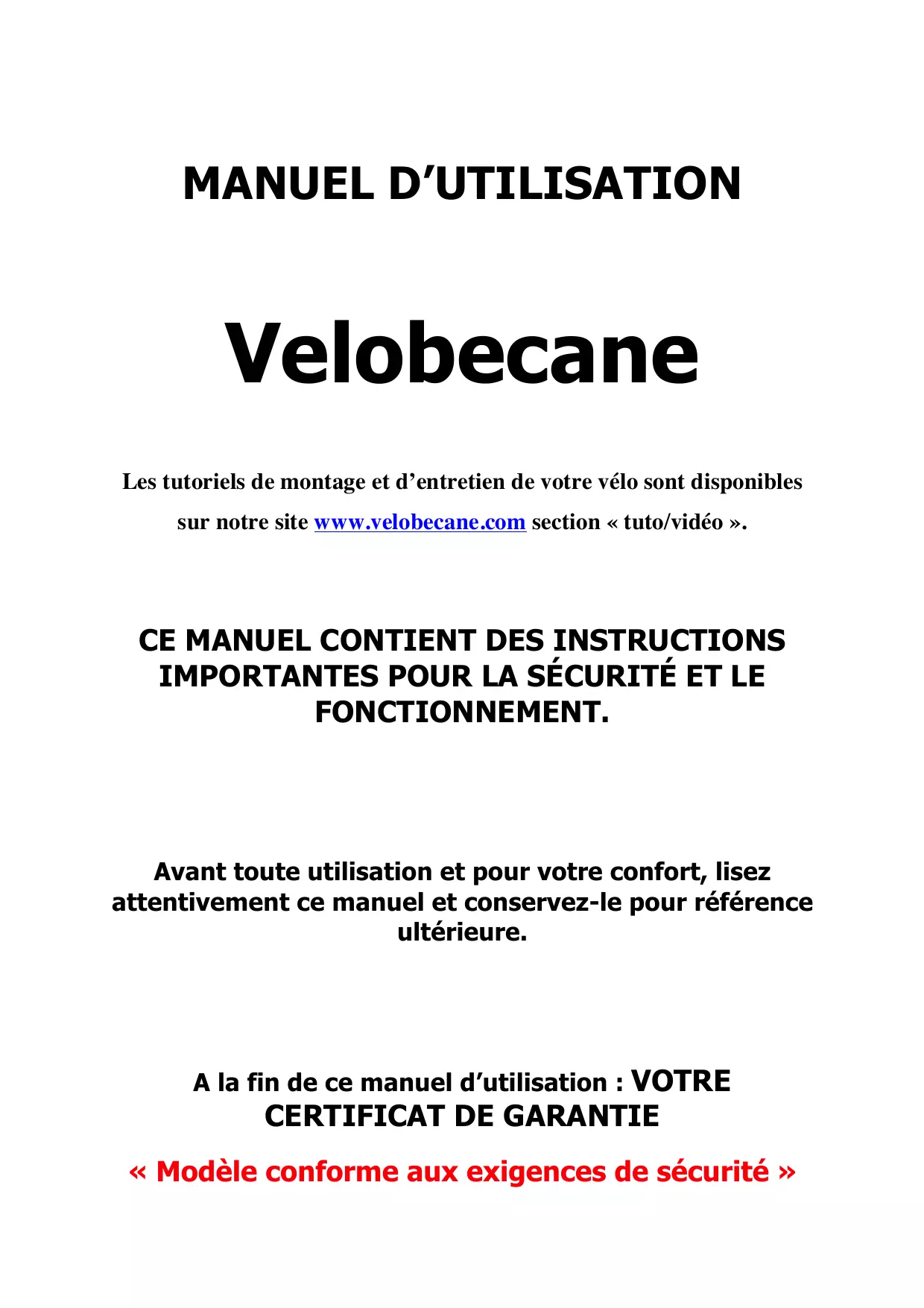 NC - Vélo électrique VELOBECANE - Notice d'utilisation et mode d'emploi gratuit