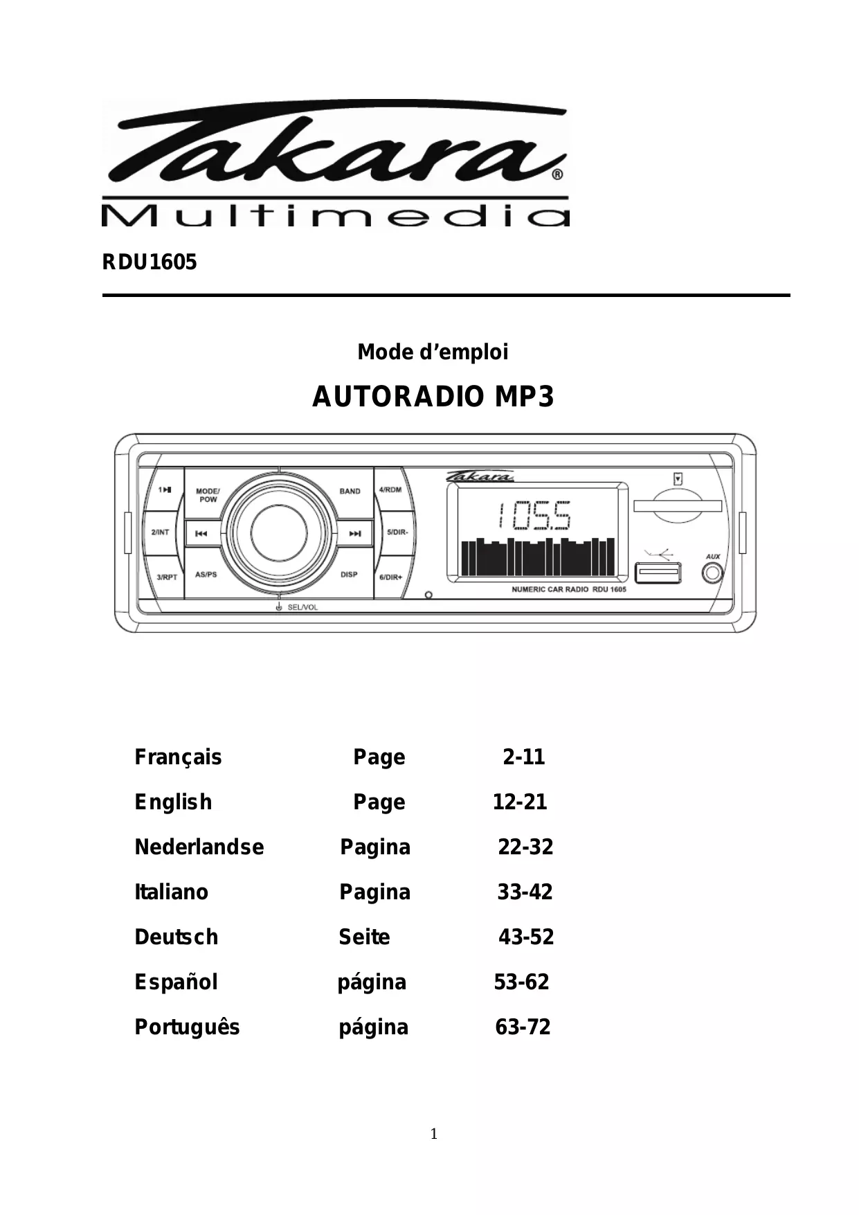 RDU1605 - Autoradio TAKARA - Notice d'utilisation et mode d'emploi gratuit